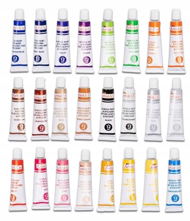 Набор состоит из 24 тюбиков акриловых красок, каждый из которых имеет емкость 12 мл. Здесь вы найдете как базовые цвета, так и специальные золотые и серебряные краски.