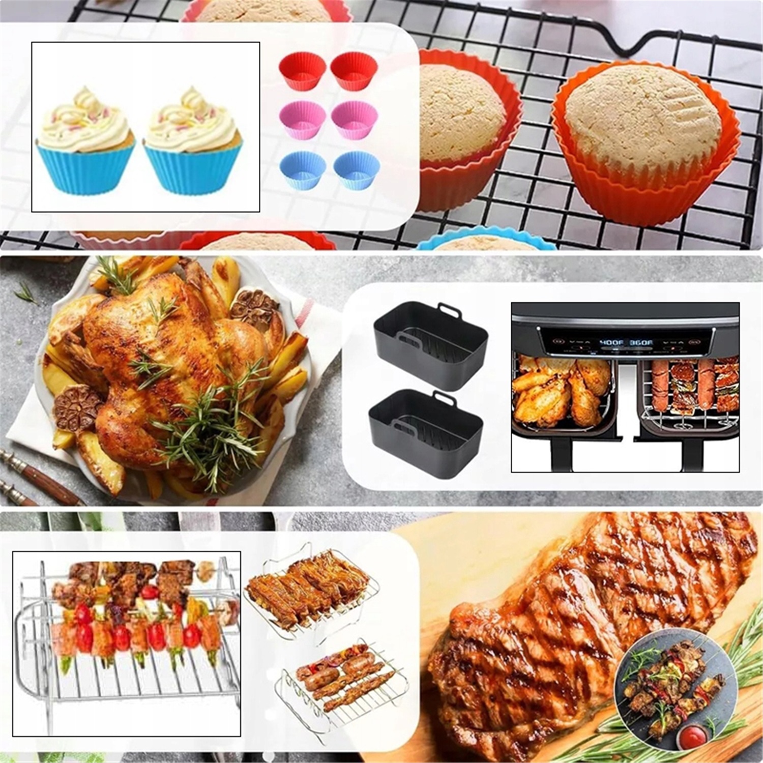 - Наши аксессуары для аэрофритюрниц изготовлены из нержавеющей стали 304 и пищевого материала, не содержат BPA, не имеют запаха, не прилипают, не деформируются, долговечны и пригодны для повторного использования. Наши аксессуары для аэрофритюрниц можно использовать при температуре от -20°C до 220°C и подходят для аэрофритюрниц, духовок и микроволновых печей.