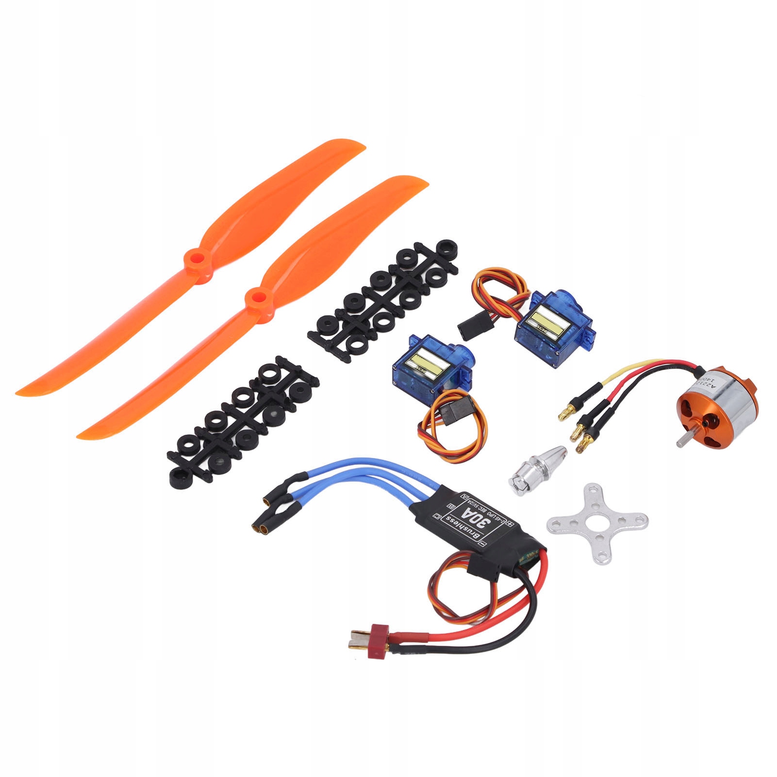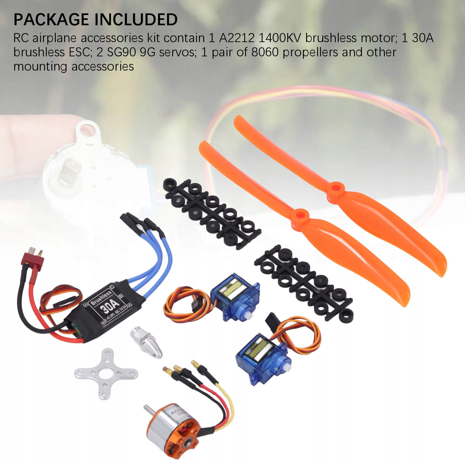 4. В КОМПЛЕКТ ВХОДЯТ: В комплект аксессуаров для радиоуправляемого самолета входит 1 бесщеточный двигатель A2212 1400 кВ; 1 бесщеточный регулятор скорости 30 А; 2 сервопривода SG90 9G; 1 пара пропеллеров 8060 и другие монтажные аксессуары