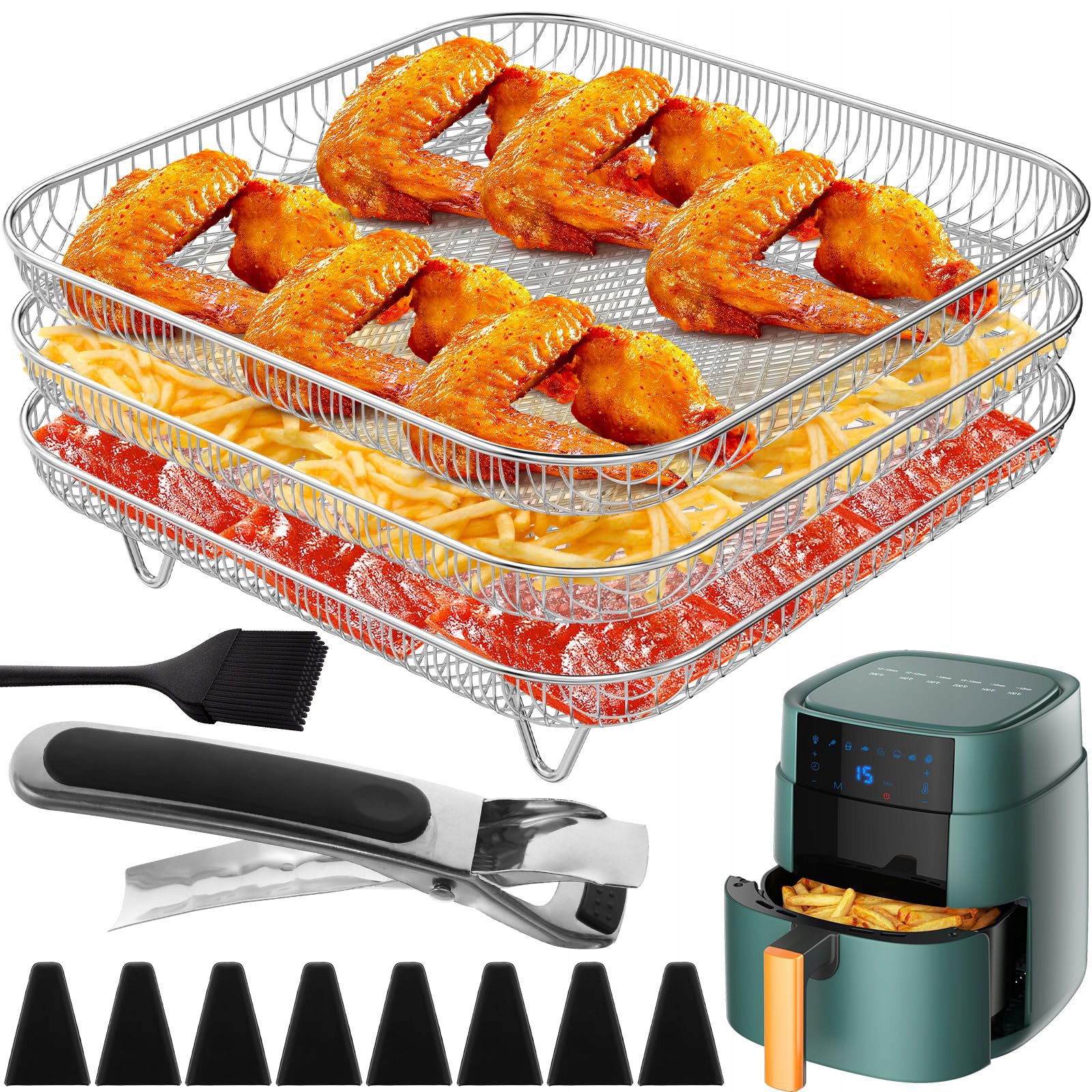 ✅ Эффективно: плоскогубцы из нержавеющей стали, устойчивая к ожогам, позволяют легко поднять жаркие решатели без риска ожогов. Решетка фри также можно использовать в качестве подноса или основания для сушки фруктов или овощей, таких как приготовленная брокколи и морковь, предотвращая их приготовление.