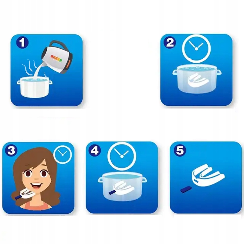 Чтобы отрегулировать наложение в рот, вы должны впитывать его в горячей воде с температурой около 80 ℃ в течение примерно 25 секунд , затем положить его в рот и приспособить к челюсти и, наконец, намочить в холодной воде на 1 минуту. Вы можете адаптировать продукт к вашим потребностям много раз - просто повторите вышеуказанные шаги. Не забудьте использовать ручку в наборе в наборе.