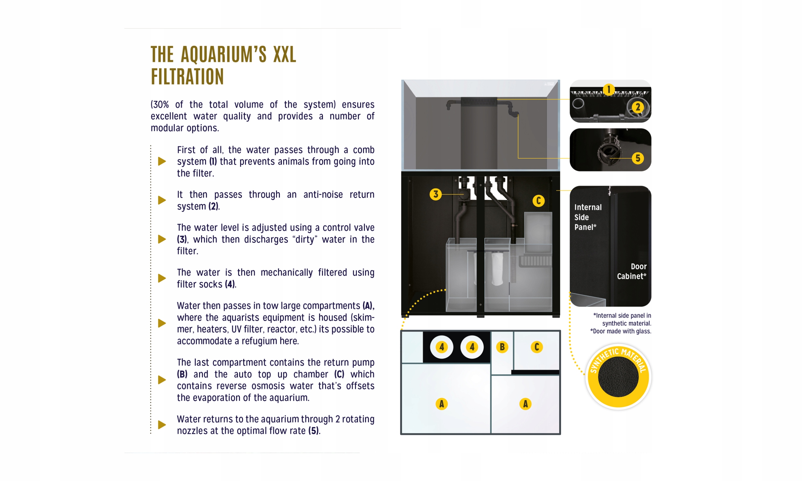 Аквариум изготовлен из стекла Super Opti-White, что не только придает ему элегантный вид, но и позволяет наблюдать за обитателями аквариума в их естественных цветах.