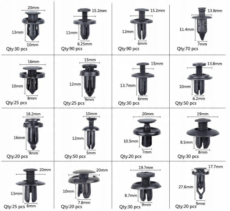 Универсальный набор автомобильных зажимов, штырей и защелок для крепления обивки автомобиля, крыльев, бамперов, дверей.
