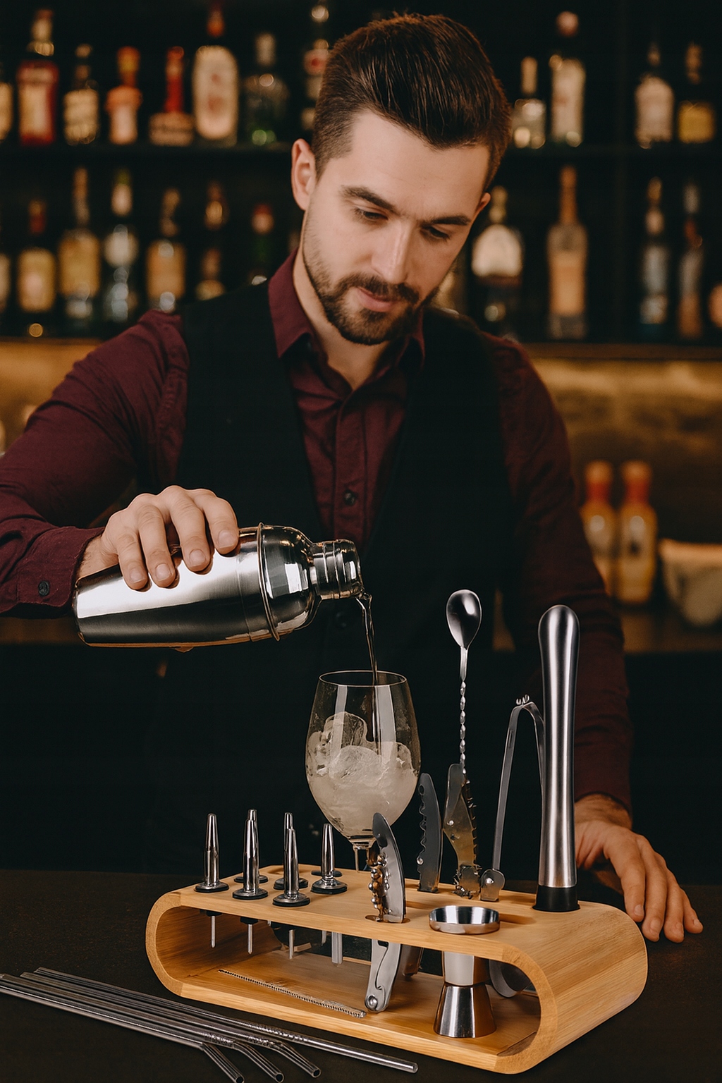 Создавайте коктейли, как настоящий бармен! Этот обширный набор для бармена 23 в 1 — идеальный выбор для новичков и профессионалов. В нем есть все необходимое для приготовления впечатляющих напитков во время вечеринки, встречи с друзьями или романтического вечера. В комплект также входит элегантная бамбуковая подставка и практичный чехол, что делает хранение и транспортировку набора чрезвычайно удобным.