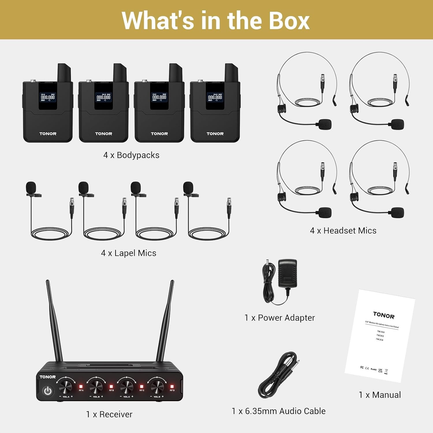 Надежное беспроводное соединение: наш приемник обеспечивает исключительный радиус действия 200 футов/60 м, что позволяет проводить неограниченное количество презентаций как в помещении, так и на открытом воздухе. Поддерживая до 40 одновременных комплектов без помех, наша система с 4 микрофонами обеспечивает стабильное беспроводное соединение с 10 каналами в каждом поясном передатчике.