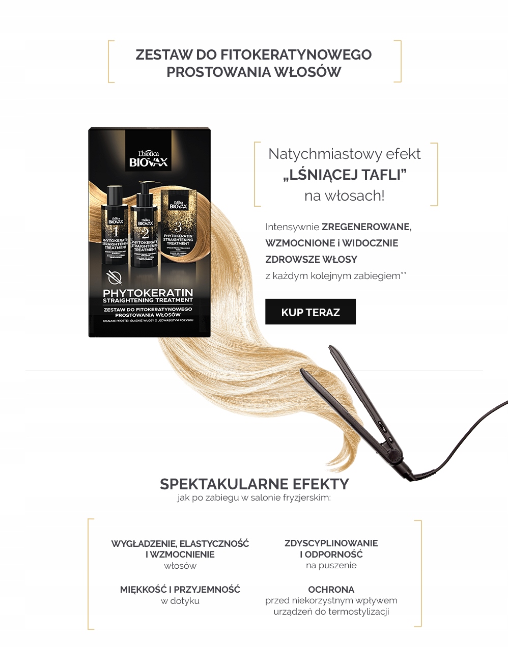 Он разглаживает пряди и восполняет микроповреждения в структуре волос. обеспечивая тем самым эффект прямых волос, гладких и блестящих волос со здоровым блеском. Формулы фитокератиновых выпрямляющих средств защищают пряди волос от негативного воздействия приборов для термоукладки, например, выпрямителя.