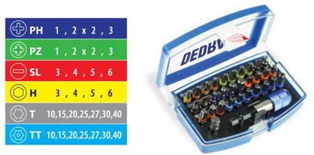 Набор 32 отверток. В комплект входят насадки PH, PZ, SL, H, T и TT. Наконечники изготовлены из стали S2, которая отличается высокой прокаливаемостью и ударопрочностью. Благодаря соответствующему химическому составу и термической обработке наконечники длительное время сохраняют свои высокие прочностные свойства. Все упаковано в удобную пластиковую коробку.
