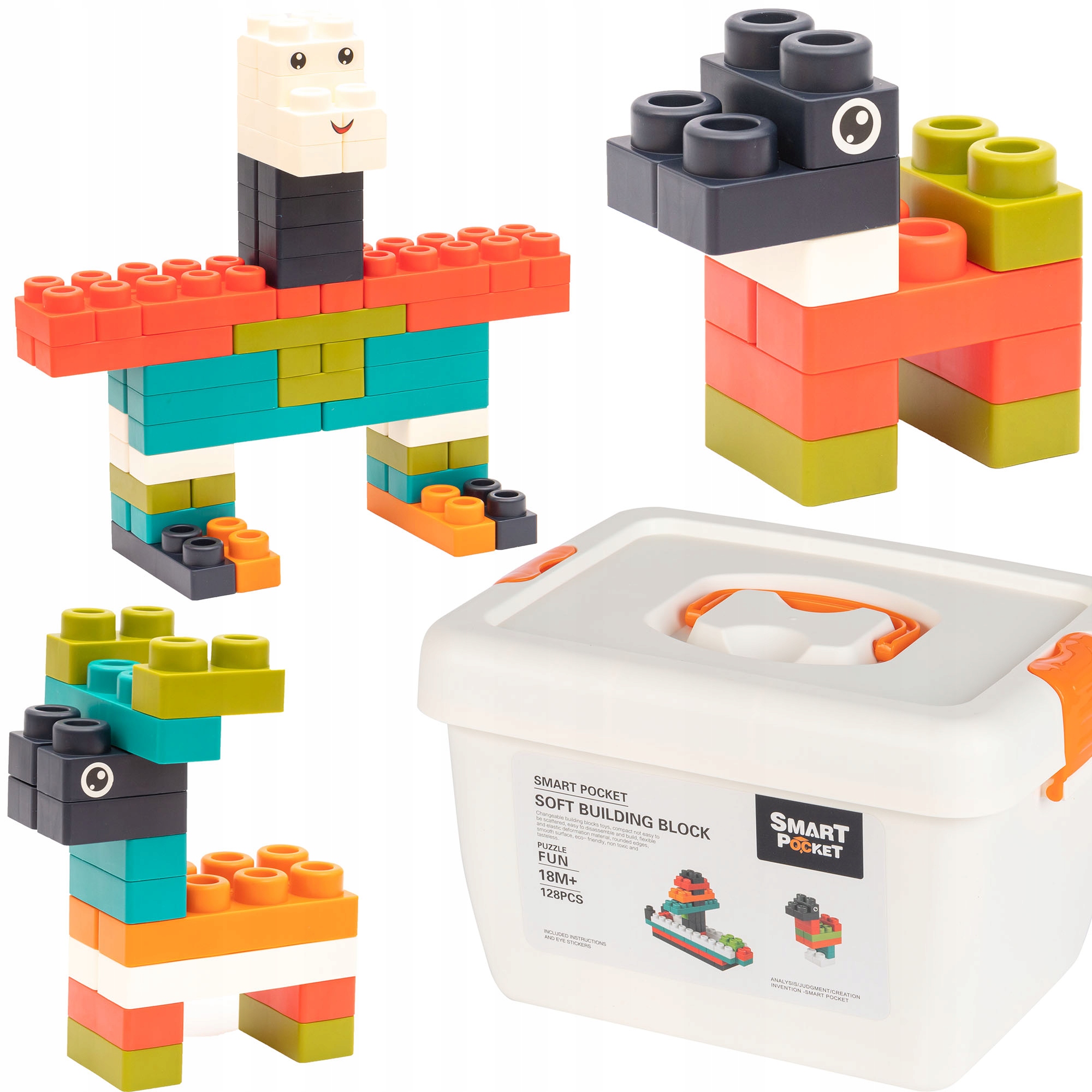 Набор блоков насчитывает целых 128 элементов, что позволяет строить сразу несколько конструкций и играть с большей группой сверстников. Блоки упакованы в красивую пластиковую коробку, в которой можно хранить блоки после игры и поддерживать порядок в комнате.