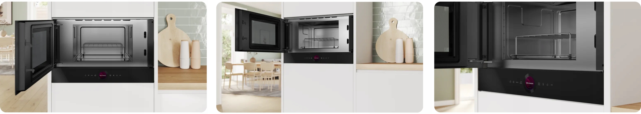 - Духовка с 14 видами нагрева: 3D-конвекция, верхний/нижний нагрев, гриль с циркуляцией воздуха, большой гриль, малая поверхность, функция пиццы, нижний нагрев, низкотемпературное приготовление, размораживание, предварительный нагрев, поддержание тепла, нежная конвекция, мягкий верхний/нижний нагрев, воздушная жарка.