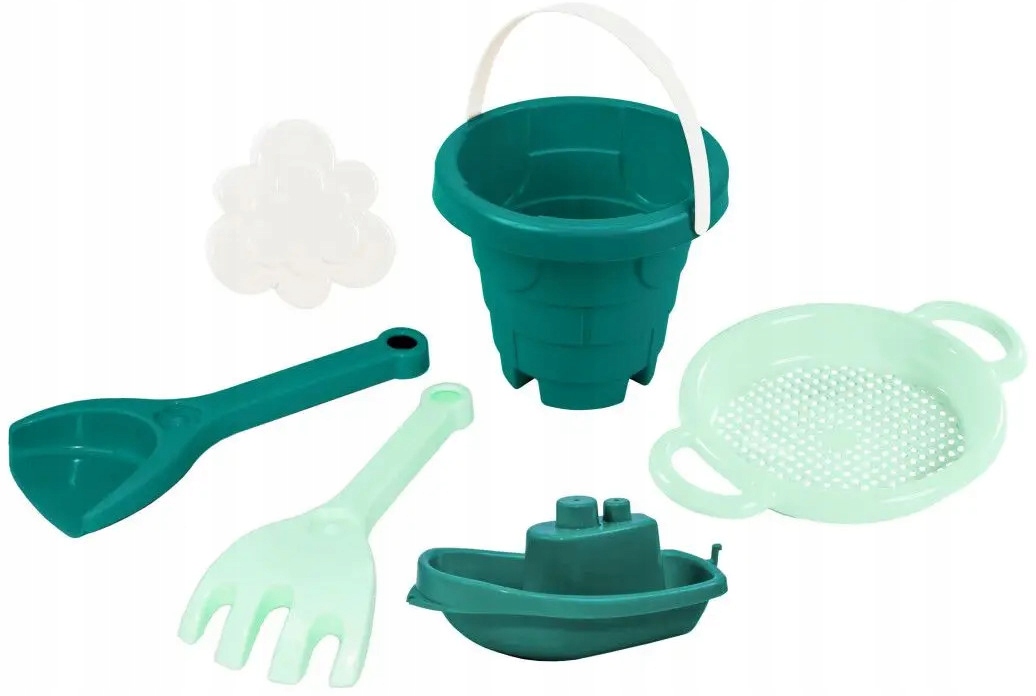 - В набор входят 6 элементов: лопатка, грабли, 1 форма, кораблик, ситечко и ведро в виде замковой башни.