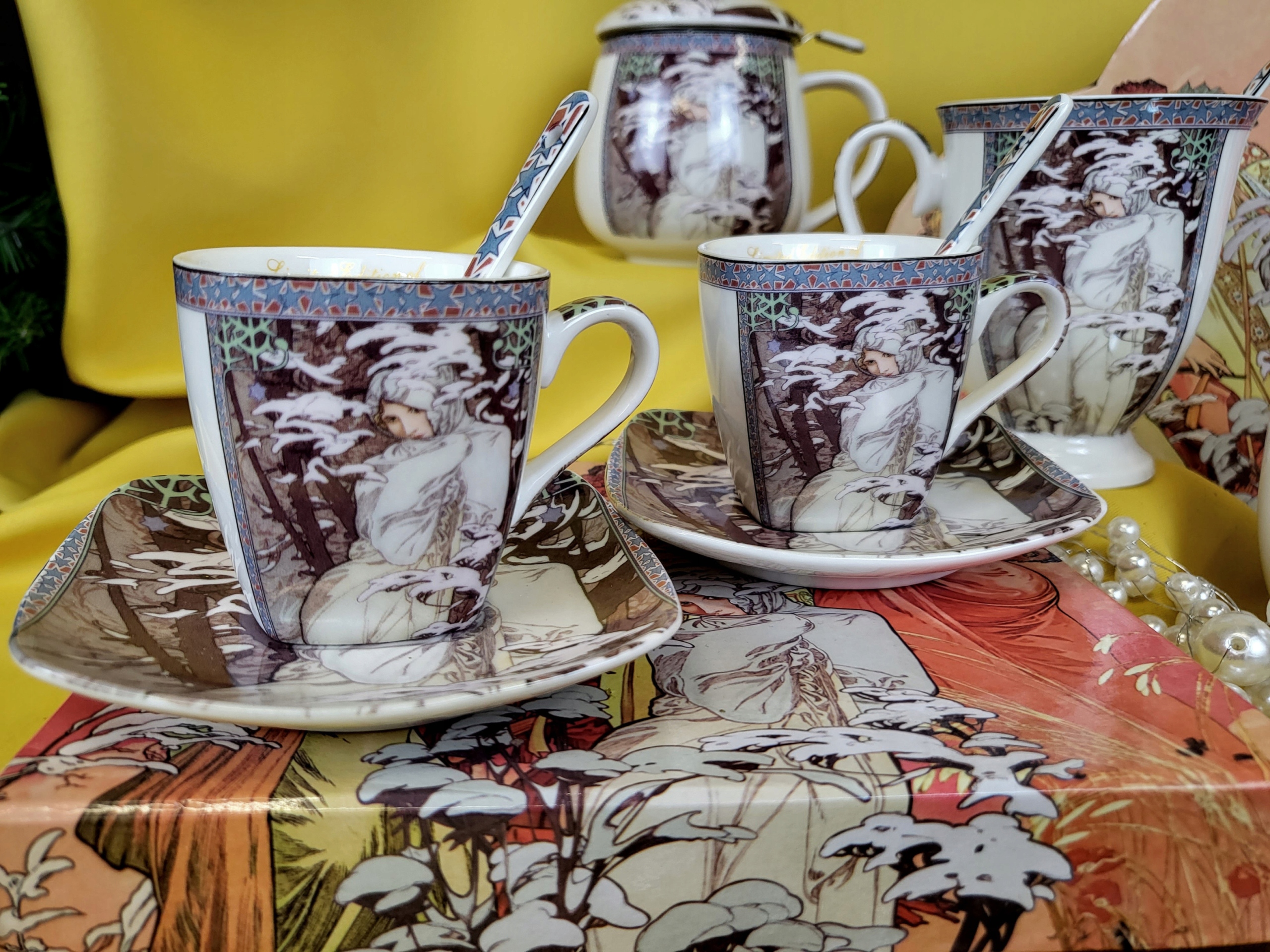 Набор станет идеальным подарком для любителей творчества Альфонса Мухи. На чашках изображена картина его работы «Зима 1900 года».