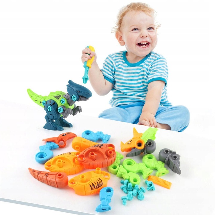 четыре фигурки динозавров (Ceratops, Raptor, Triceratops, Tyrannosaur) ждут складывания! В наборе вы найдете отвертку с двумя наконечниками и отверткой, которая поможет вашему ребенку прикрутить и открутить винты. Это отличное упражнение с небольшими моторными навыками, которые дополнительно дают очень веселье!