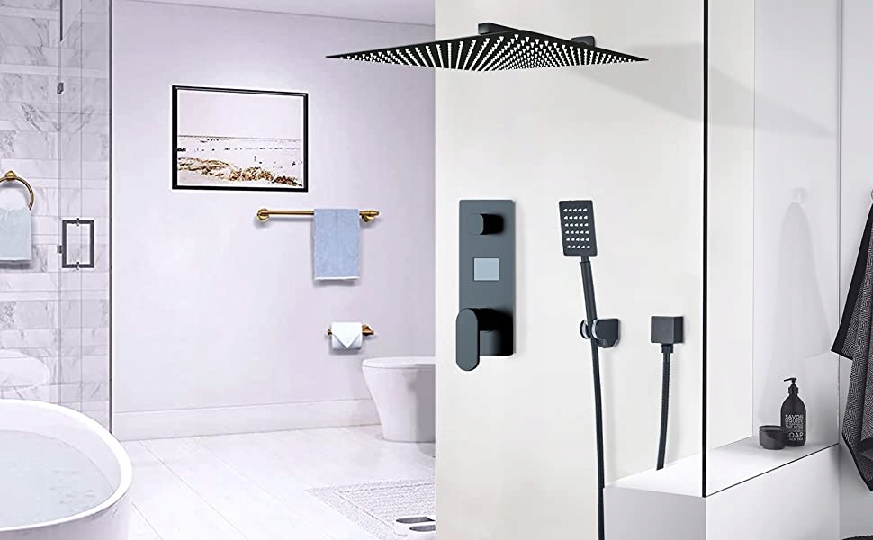 <ул>- Высокое качество: квадратная насадка для дождевого душа 16 дюймов (нержавеющая сталь 304), ручная насадка для душа (массивная латунь), разбрызгиватель 14 дюймов (массивная латунь), душевой шланг 1,5 м (нержавеющая сталь 304)), душ ручка (АБС-пластик), смесительный клапан для душа (массивная латунь).