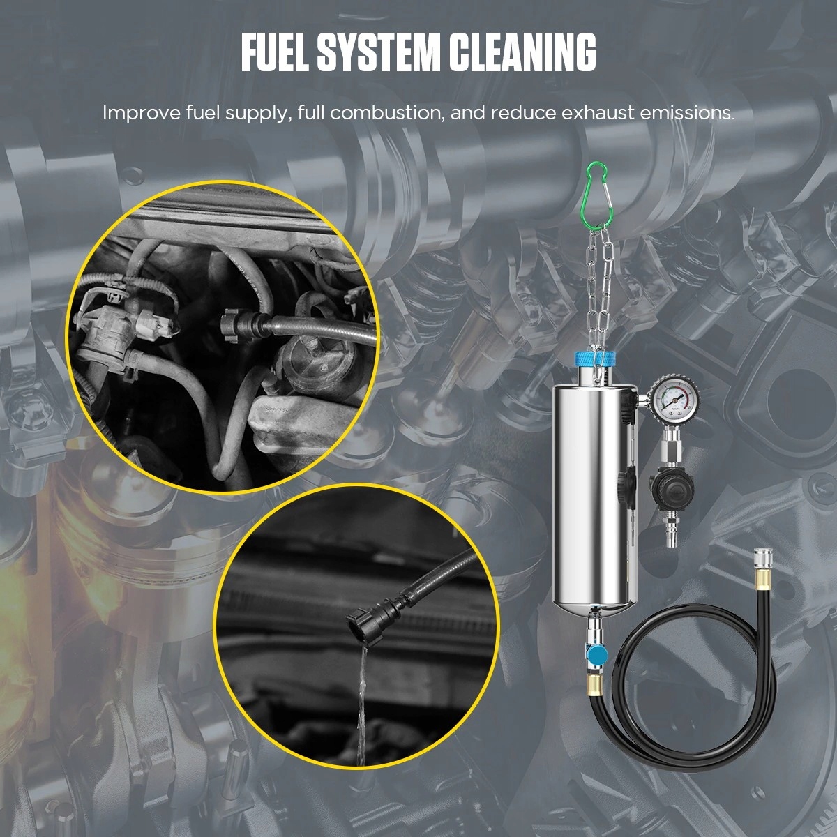 Устройство, работающее на сжатом воздухе, позволяет производить очистку системы впрыска без необходимости демонтажа двигателя.