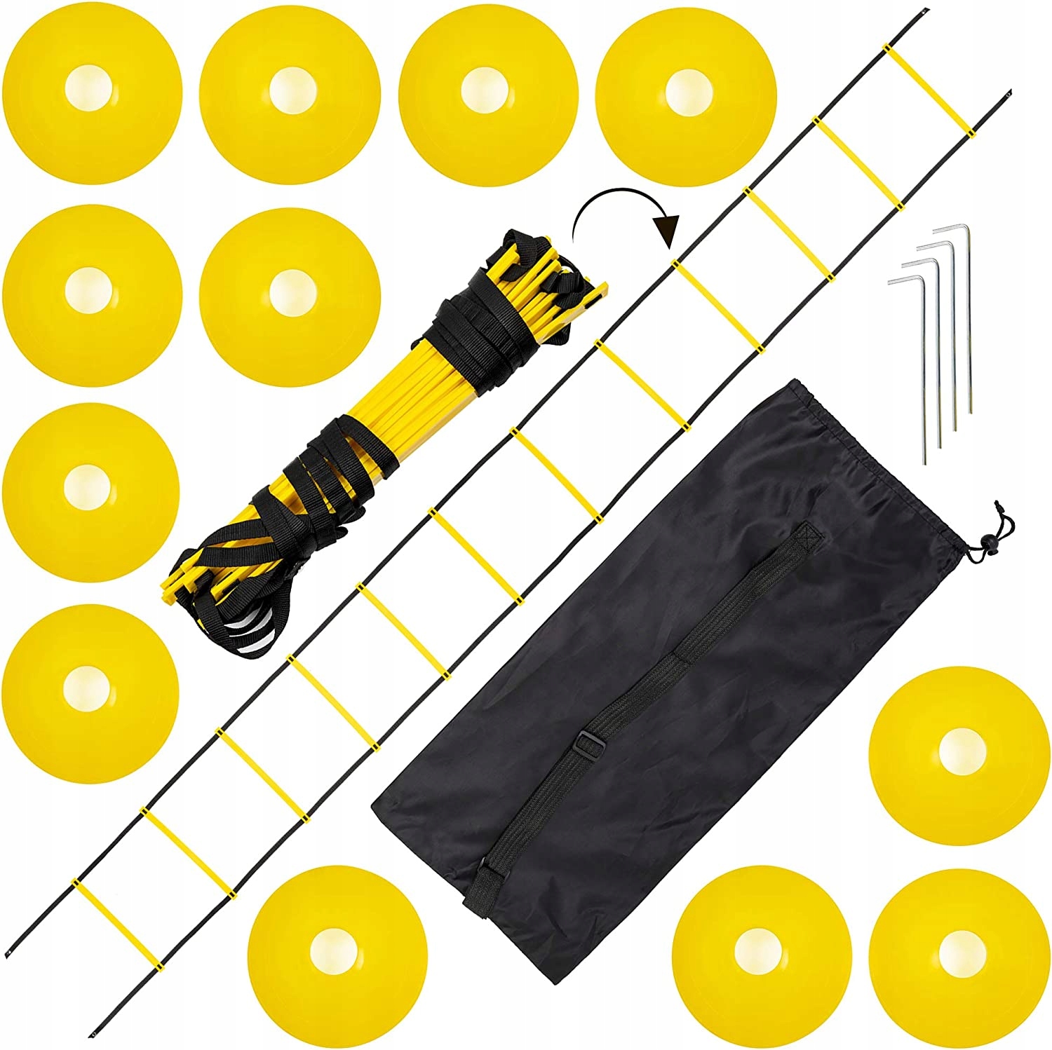 В комплект входят 6 лестниц и 12 конусов, изготовленных из прочного материала, который обеспечит долгий срок службы комплекта. Длина лестниц составляет 6 метров, что позволяет тренироваться в различных условиях и повышает их функциональность. Лестница имеет 10 ступенек, которые расположены на равном расстоянии друг от друга, что обеспечивает безопасность и устойчивость во время тренировок.