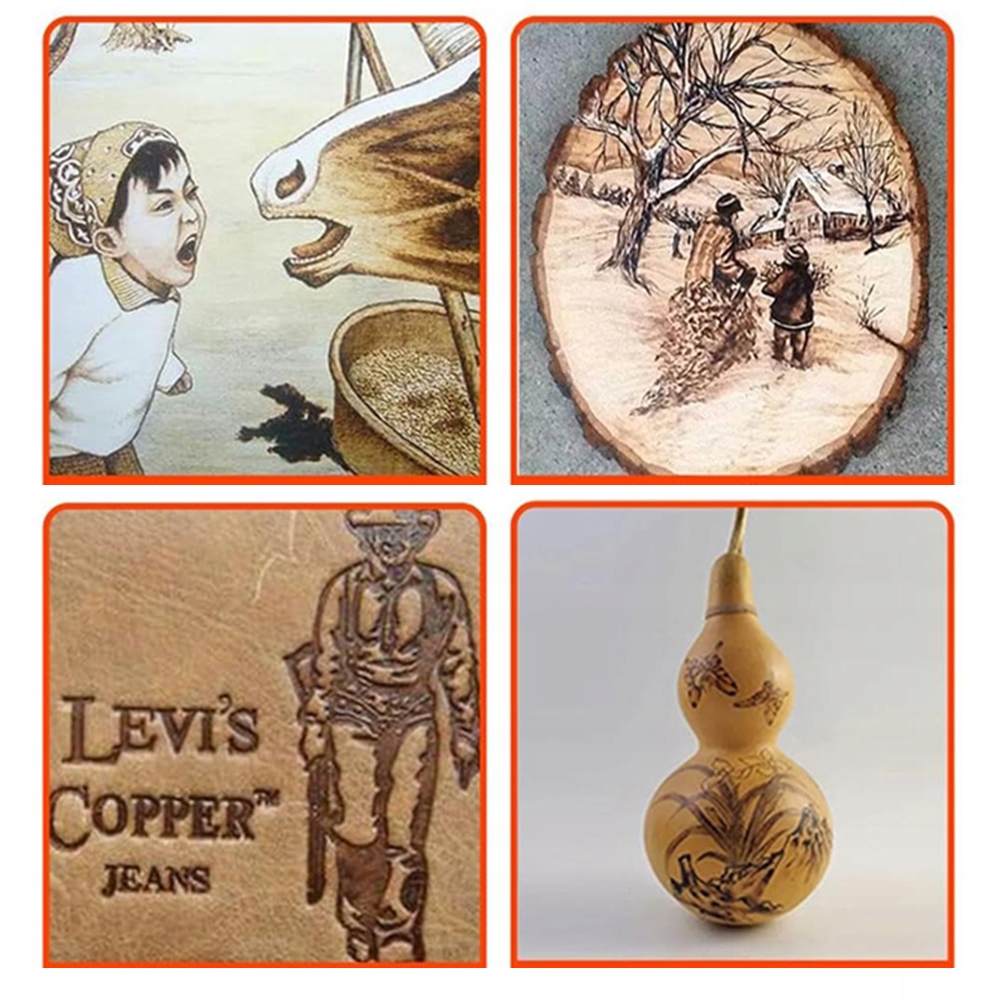 В комплект входят 23 медных насадки разных размеров, что делает их достаточно универсальными для различных проектов по выжиганию кожи. Гибкое использование таких техник, как штриховка, контурирование, трафаретная печать и каллиграфия, позволяет легко использовать различные стили пирографии.