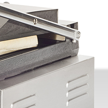 Чрезвычайно простое и интуитивно понятное управление с помощью кнопки включения/выключения и двух термостатов с плавной регулировкой температуры до 250°C в двух зонах нагрева (четыре передних и три задних ролика). Благодаря двум зонам мы можем нагревать новые, замороженные колбасы в одной до более высокой температуры, а в другой только поддерживать их температуру. Контрольные лампочки информируют о нагреве и запуске машины.