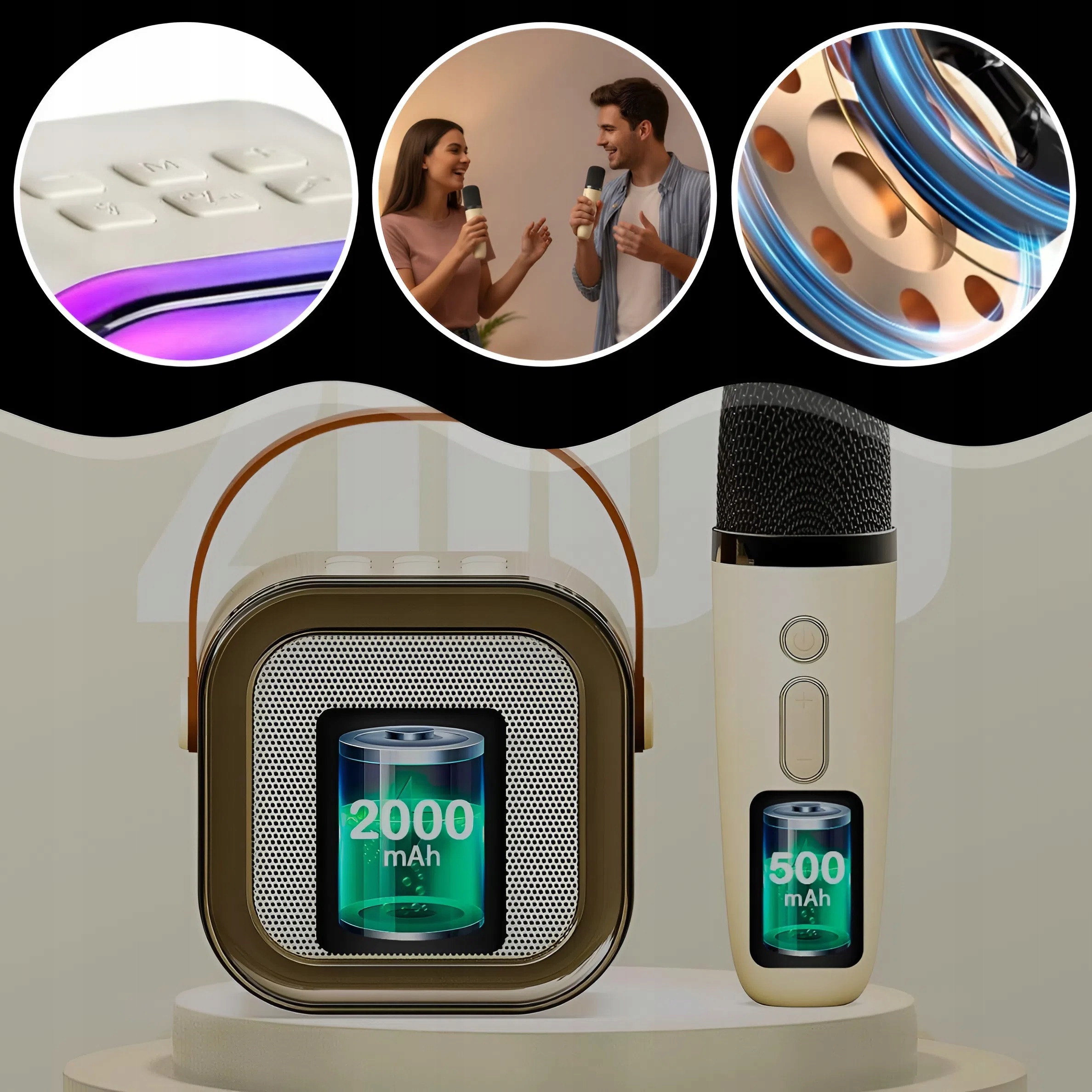Портативный караоке-набор с микрофоном динамик и два микрофона элегантного бежевого цвета — идеальный выбор для дней рождения, домашних вечеринок и семейных посиделок. Благодаря RGB-подсветке и мощному звуку каждое караоке станет незабываемым развлечением.