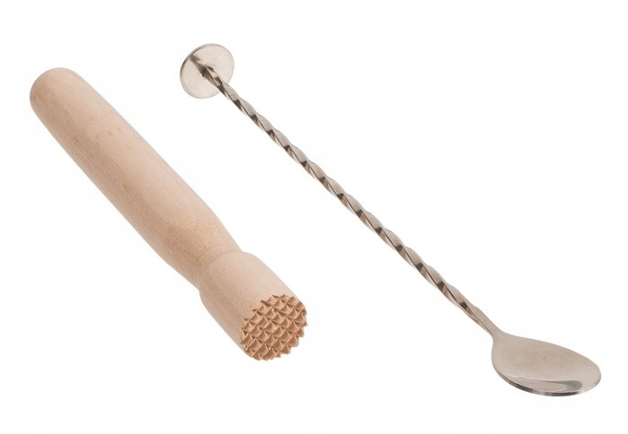 - Включает в себя шейкер из нержавеющей стали, стакан, деревянную насадку, ложка и ситечко для льда.