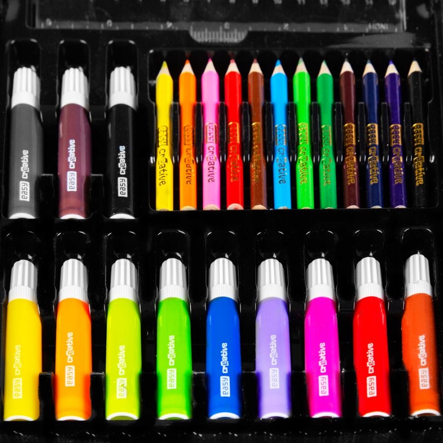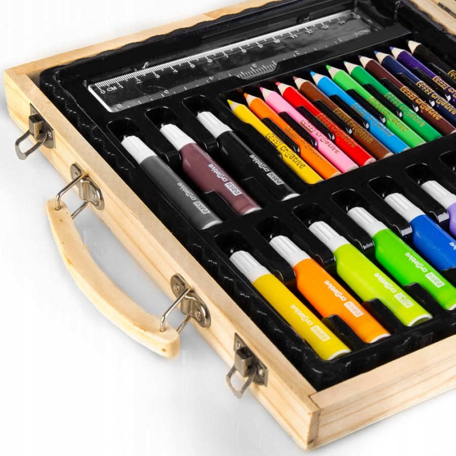 Арт-набор — отличное начало приключений юного художника. Набор функционален и состоит из 68 практичных элементов. Множество аксессуаров сделают каждое использование набора идеальным путешествием в мир искусства. В набор входят 12 фломастеров, 12 мелков, 12 масляных пастелей, 12 мелков, 12 цветов акварельных красок, линейка, карандаш, кисть, клей, ластик, точилка и палитра. Изготовленные из материалов высочайшего качества, инструменты имеют широкую цветовую гамму, что дополнительно облегчит выполнение художественных работ или повседневное использование. Весь набор был помещен в элегантный и практичный чемодан, что облегчило его переноску и дополнительно повысило эстетическую ценность всего набора. Набор для живописи и рисования – это не только незаменимая вещь для каждого школьника или любителя творческих задач, но и отличная идея для подарка.