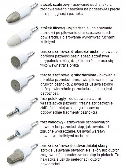 Базовая версия включает в себя 7 насадок с прочным сапфировым или фетровым покрытием. полировка. Благодаря плавной регулировке скорости и возможности установки направления вращения вправо/влево возможен профессиональный уход за ногами и ногтями, который раньше был доступен только в салоне красоты. Все накладки можно легко хранить в футляре для хранения