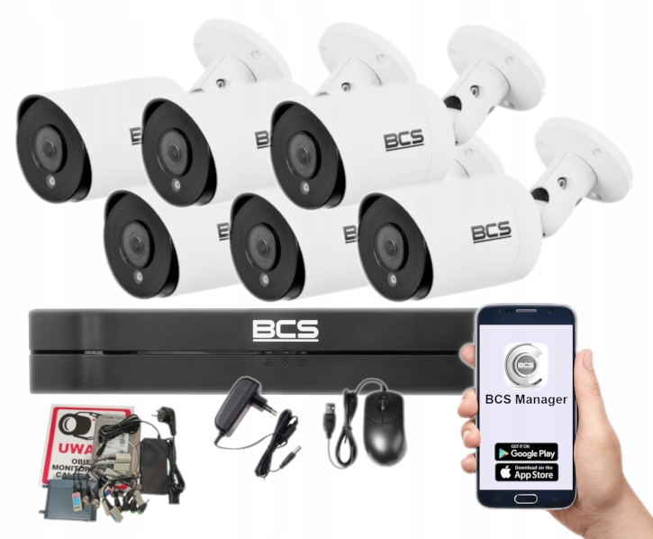 КОМПЛЕКТ МОНИТОРИНГА BCS, 6 БЕЛЫХ КАМЕР, 5 Мпикс, ВНЕШНИЙ ДИСК С ПРИЛОЖЕНИЕМ, 1 ТБ