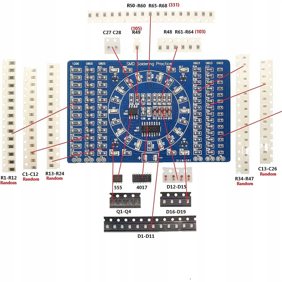 Комплект состоит из печатной платы с местами для SMD-элементов поверхностного монтажа и электронных компонентов для пайки. Самые популярные резисторы SMD, используемые в настоящее время