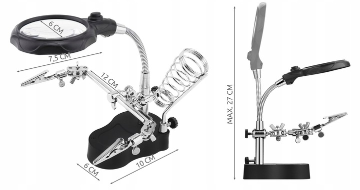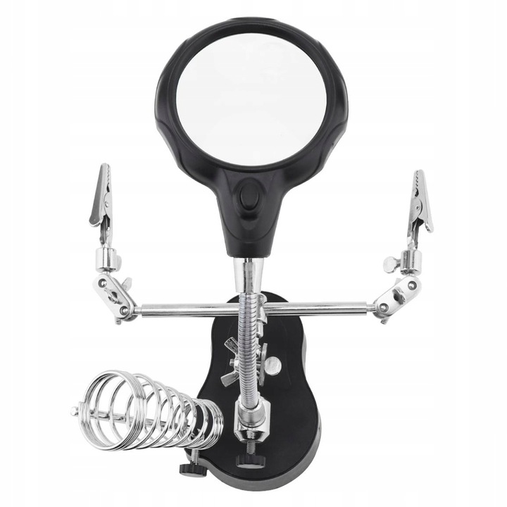Имеет спиральный держатель для паяльника и устойчивое основание. После разборки увеличительное стекло можно использовать отдельно, например, для чтения. Благодаря свободным рукам набор позволит вам свободно выполнять такие работы, как склейка, пайка, ремонт.
