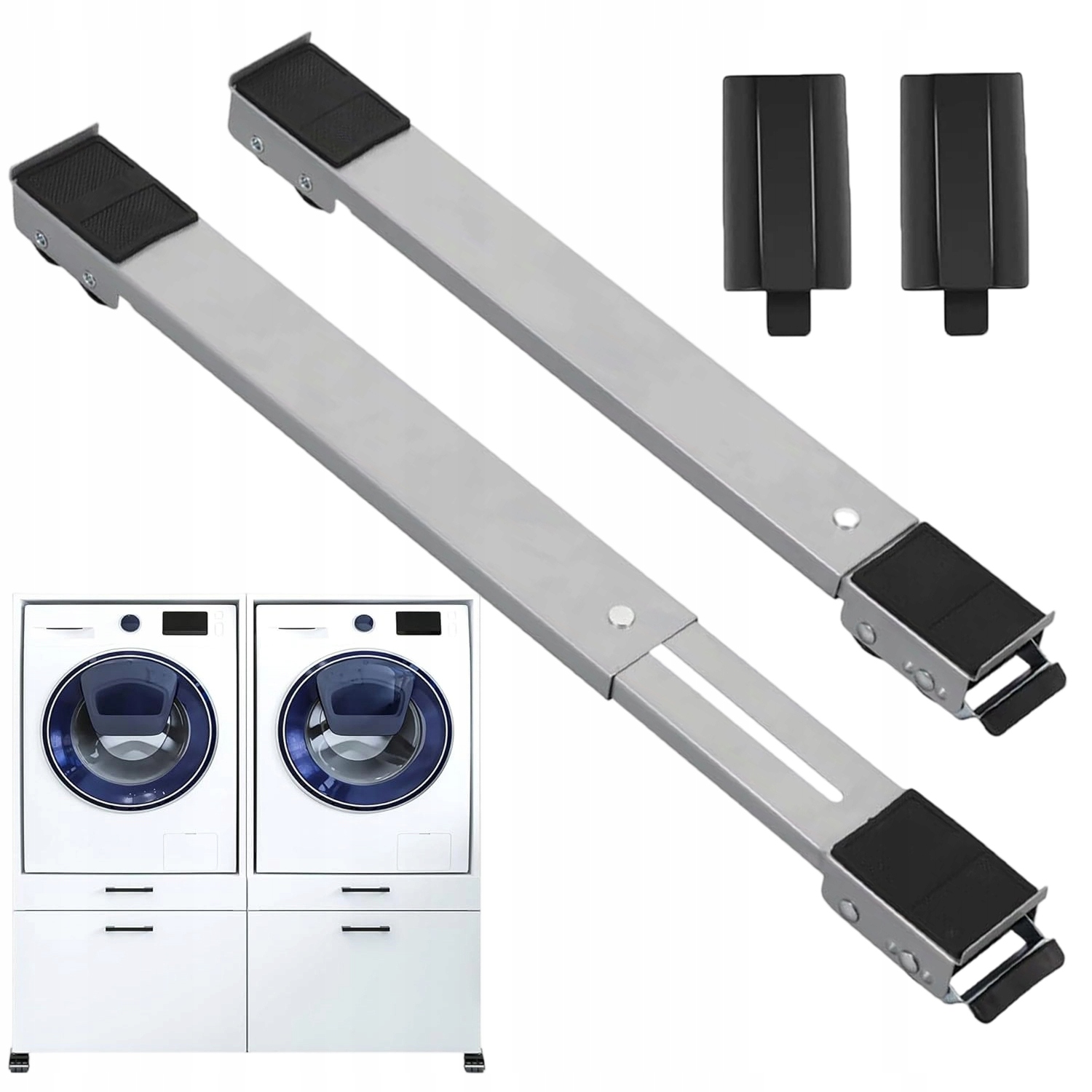- Двухрядная конструкция исключает необходимость регулировки ширины, адаптируя ее под разные нужды и позволяя легко крепить направляющие стиральной машины к мебели разных размеров.