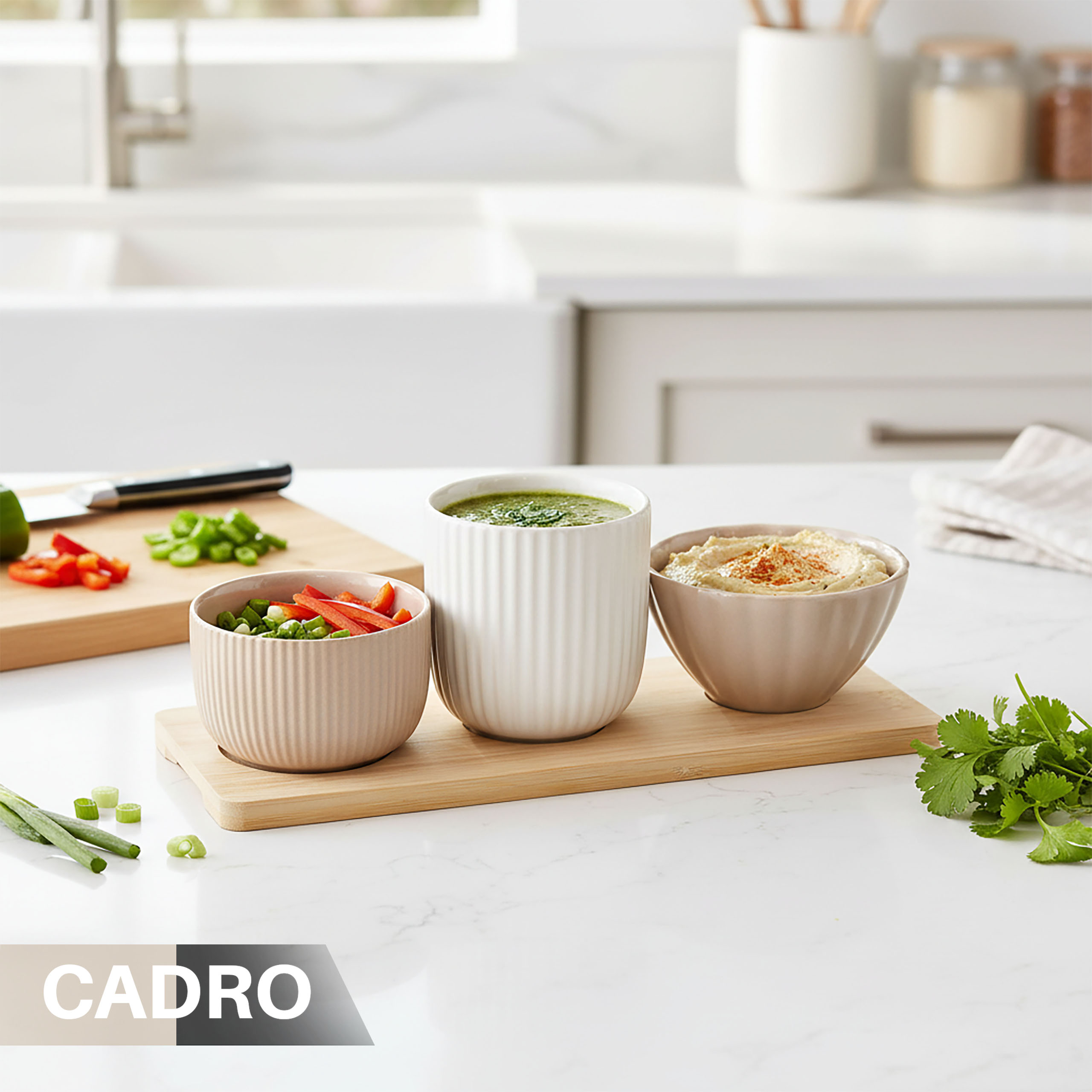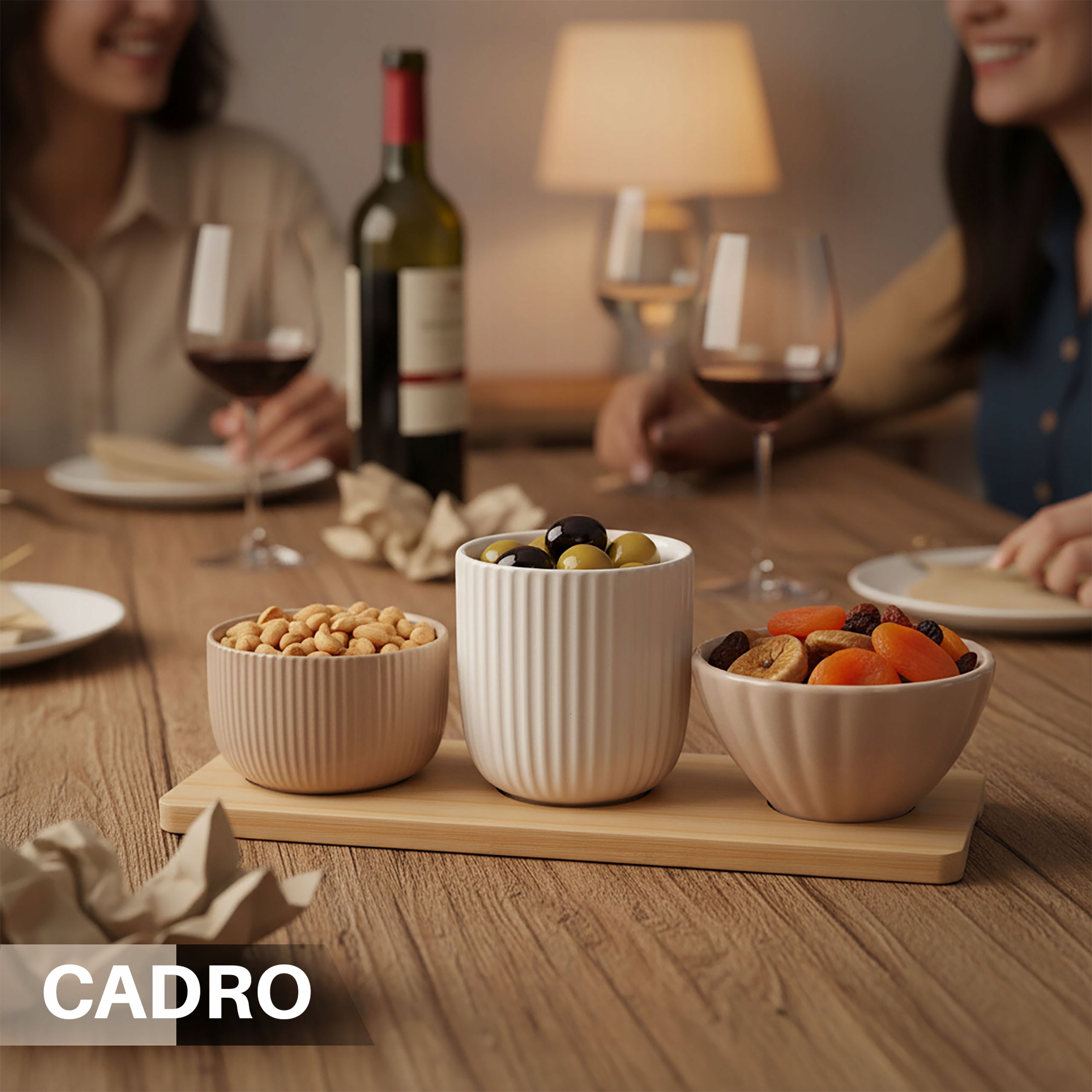 В комплект входят 3 элегантные миски и бамбуковый поднос, который облегчает переноску и эффективно подает закуски. Это готовое решение, идеально подходящее для стола.