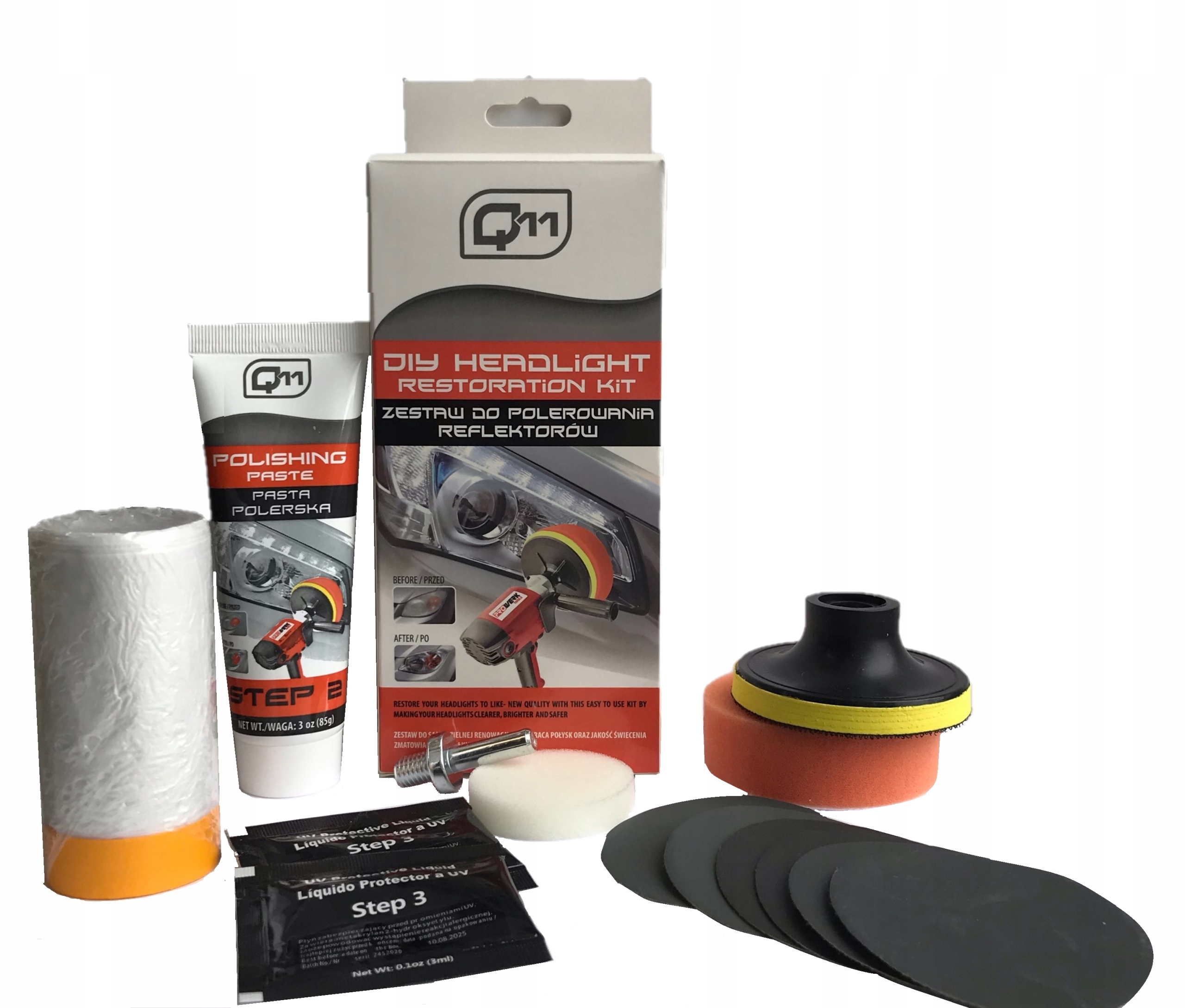 Профессиональный набор для регенерации и полировки автомобильных фар от известной компании Q11. Содержит все компоненты, необходимые для комплексного ремонта двух фар автомобиля без необходимости их демонтажа.