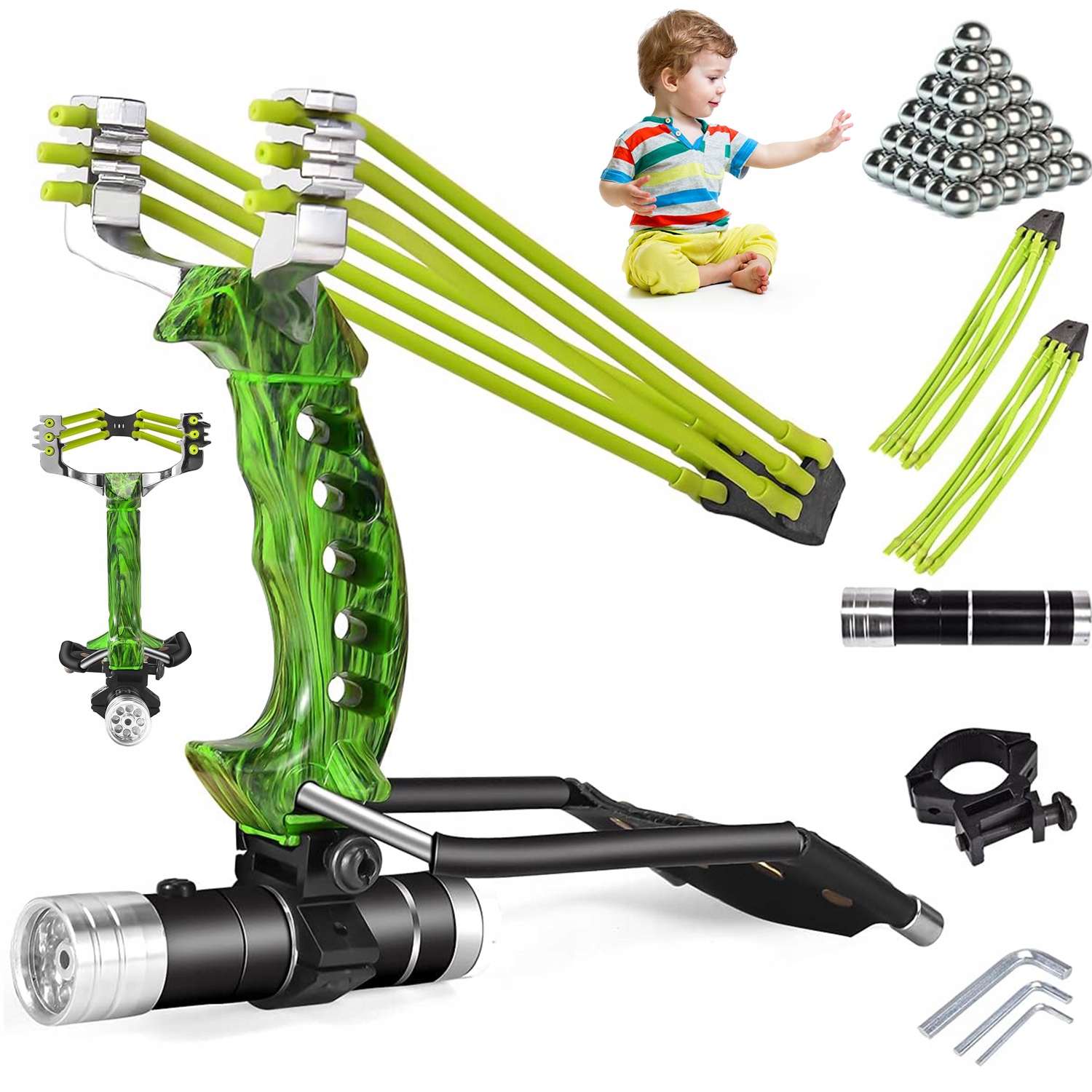 В комплекте: рогатка, 100 стальных шариков, съемный фонарик