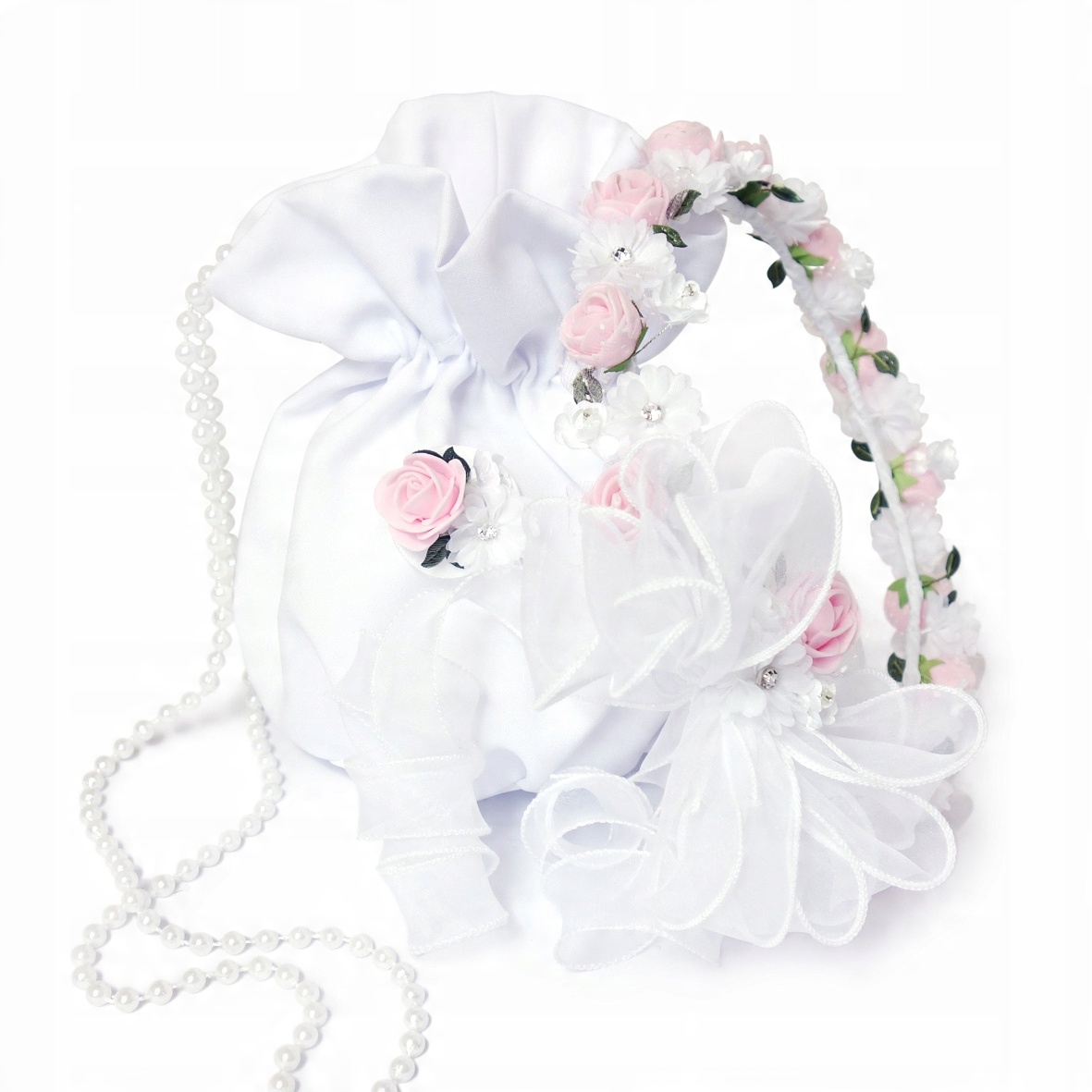 Предлагаем комплект «Первое причастие» для девочки: СУМКА+ВЕНОК. В стоимость входят оба продукта: сумка с украшением и соответствующий венок для причастия.