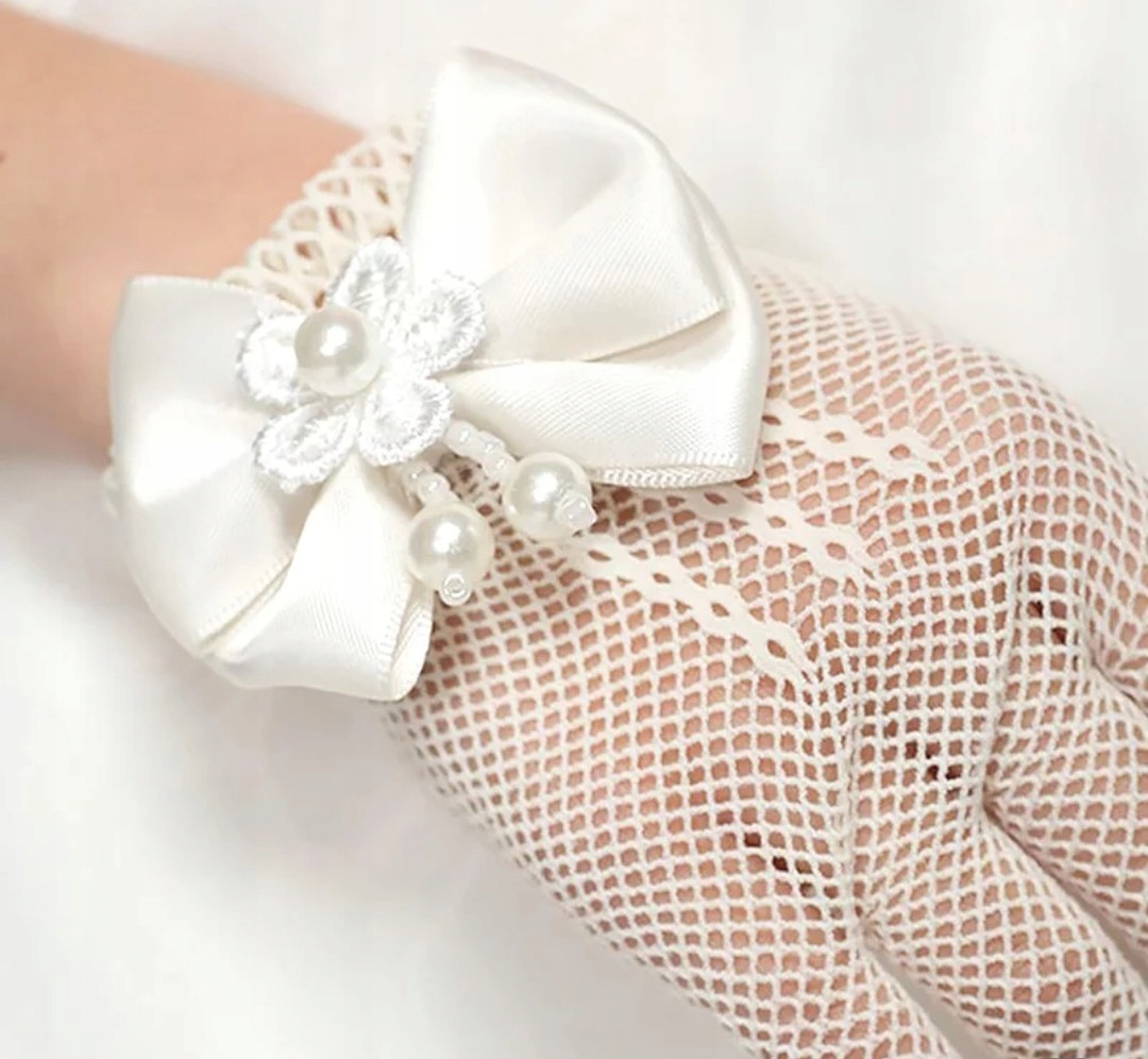Элегантные белые ажурные перчатки, украшенные красивым бантом с декоративным жемчугом и цветком. Изготовлен из эластичной лайкры.