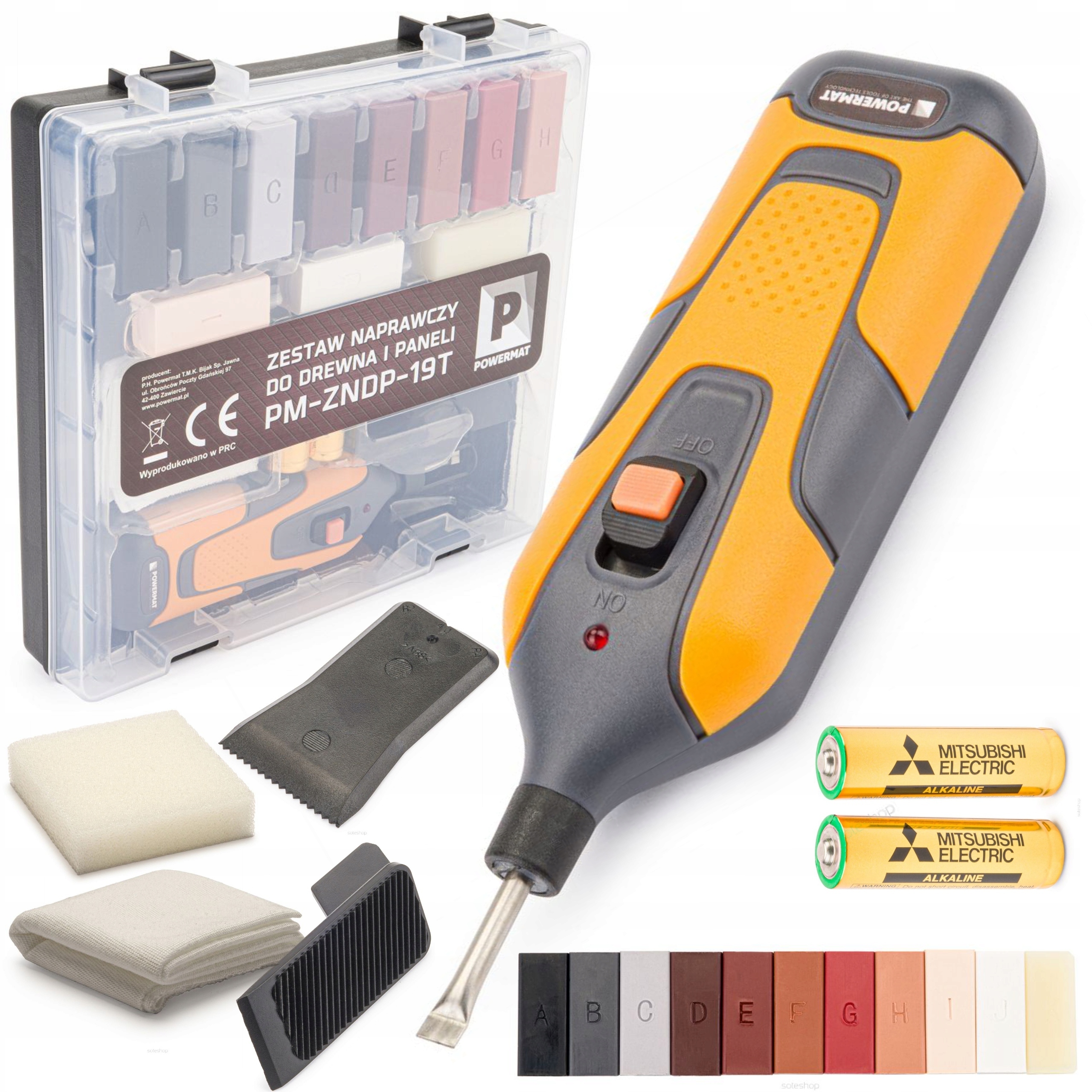 <ул>Набор POWERMAT позволяет самостоятельно устранить повреждения на деревянно-деревянных поверхностях. Его также можно использовать для ремонта повреждений на каменных и керамических поверхностях, в зависимости от желаемого цвета шпаклевки. Входящий в комплект воск восстанавливает глубокие царапины, трещины, просверленные отверстия, потертости и вмятины. 11 восковых палочек разных цветов позволяют выбрать нужный цвет. Воски можно свободно смешивать для получения соответствующего оттенка. Нагретый воск заполняет дефект, а после высыхания затвердевает и создает защитный слой.