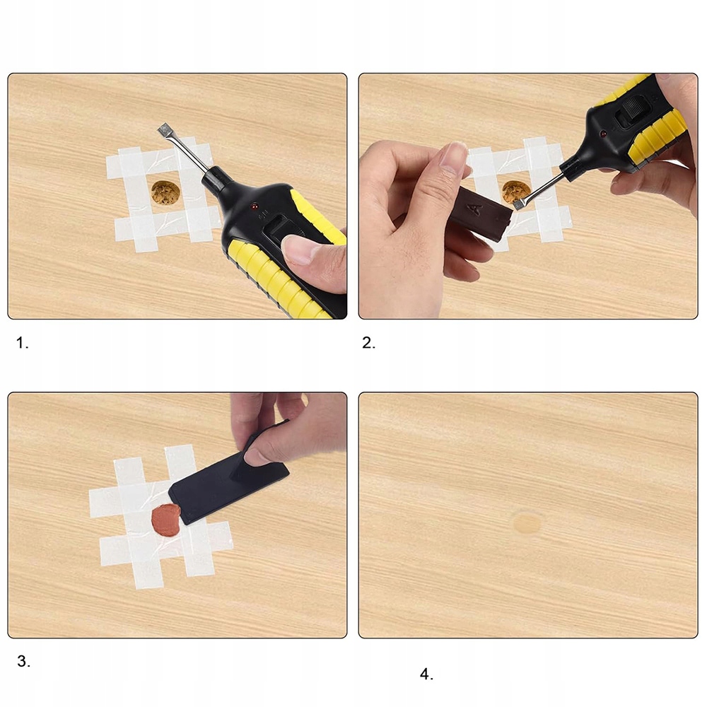 после переключения из положения «ВЫКЛ.». на «ОН». Расплавитель постоянно нагревается, при переключении из положения «ВКЛ» для нагрева не нужно постоянно нажимать кнопку. в положение «ВЫКЛ.». плавитель выходит из строя, им легко может пользоваться каждый, даже левша, а по сравнению с составом для ремонта дерева и шпаклевкой для дерева, наш ремонтный восковой блок быстро сохнет и является водонепроницаемым, после затвердевания воск прочный и устойчивый к истиранию.