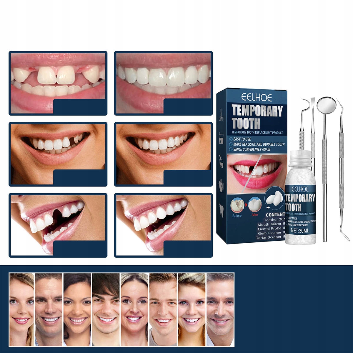 - ✅Временный ремонт: набор для ремонта зубов можно использовать для временного восстановления отсутствующих и сломанных зубов, а также помочь людям, потерявшим зубы, быстро создать аккуратные зубы.