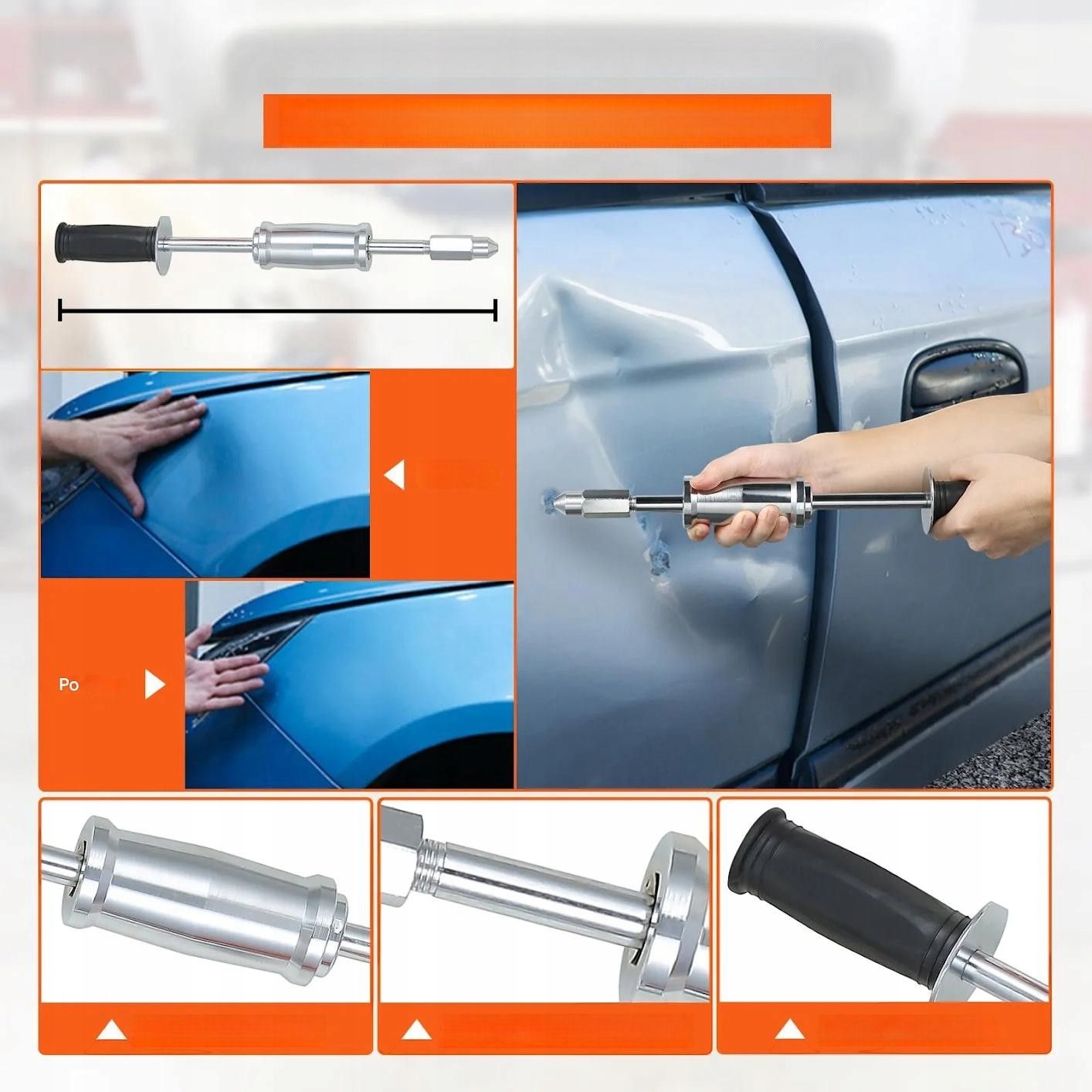В комплект входит скользящий молоток длиной 43,2 см с утолщенной рулевой тягой и нескользящей ручкой. Инструмент позволяет эффективно выправить вмятины, вернув поверхности первоначальную форму.