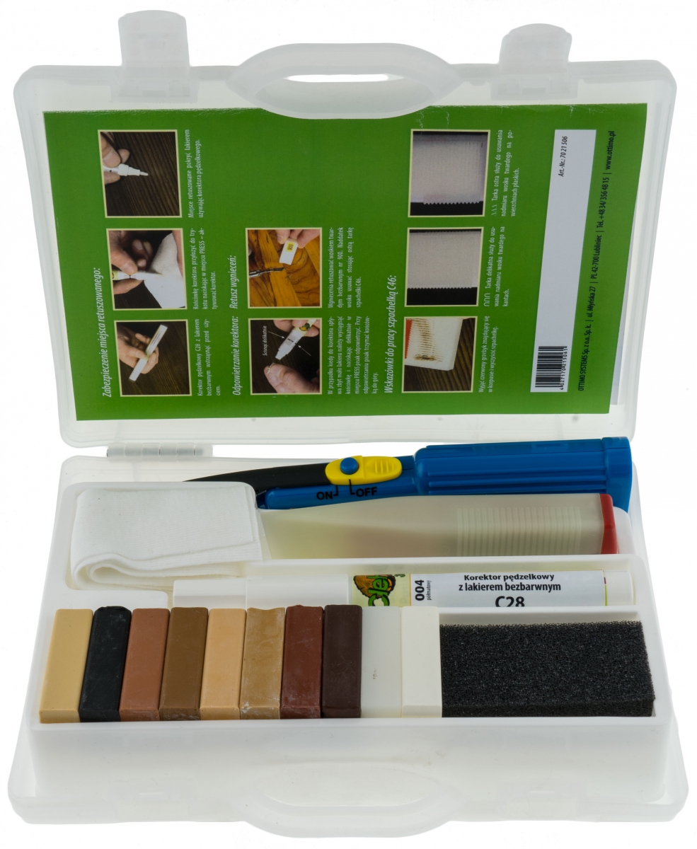 Набор для ретуши повреждений поверхностей мебели и дверей из ламината, лакированного шпона и лакированного дерева. Оптимально подходит для ремонта глубоких царапин, небольших дефектов, вмятин или поврежденных краев. В наборе 10 брусков твердого воска (оттенков дерева) и все необходимые инструменты для ретуши. Набор дополнен защитным лаком в кисточке-ручке.