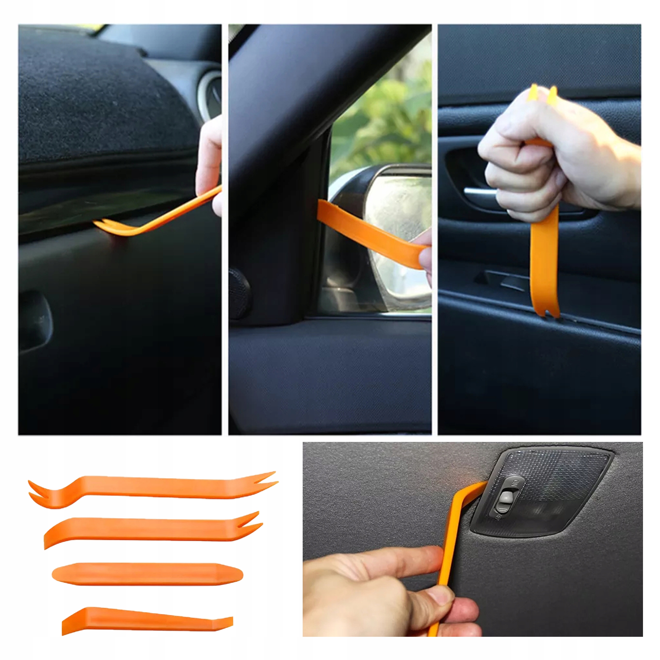 Набор из 4 съемников разной длины и формы для безопасного снятия обивки, молдингов автомобиля, дверных обшивок и т. д. Особенно рекомендуются для работ в автосервисах, кузовных, покрасочных и автодеталей.