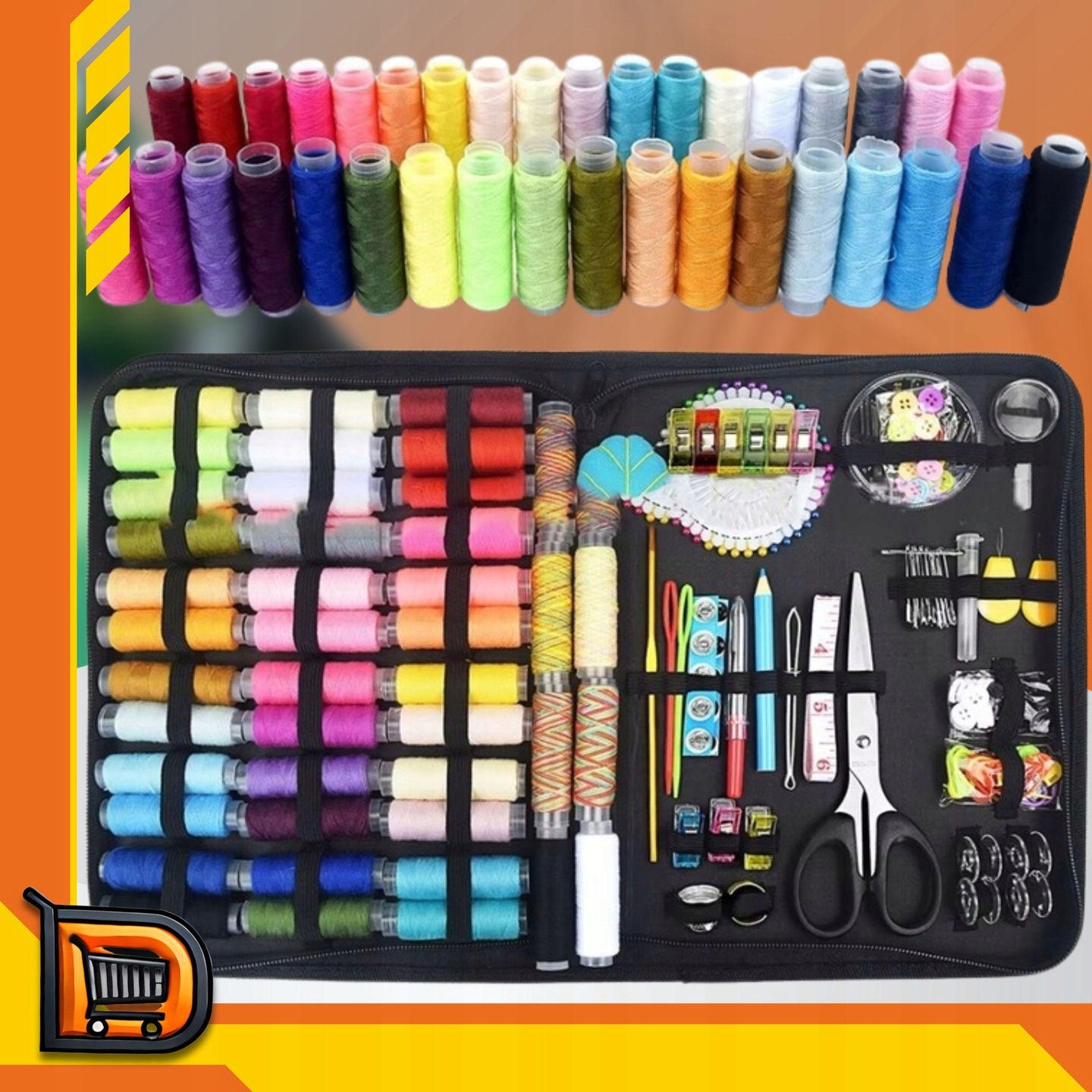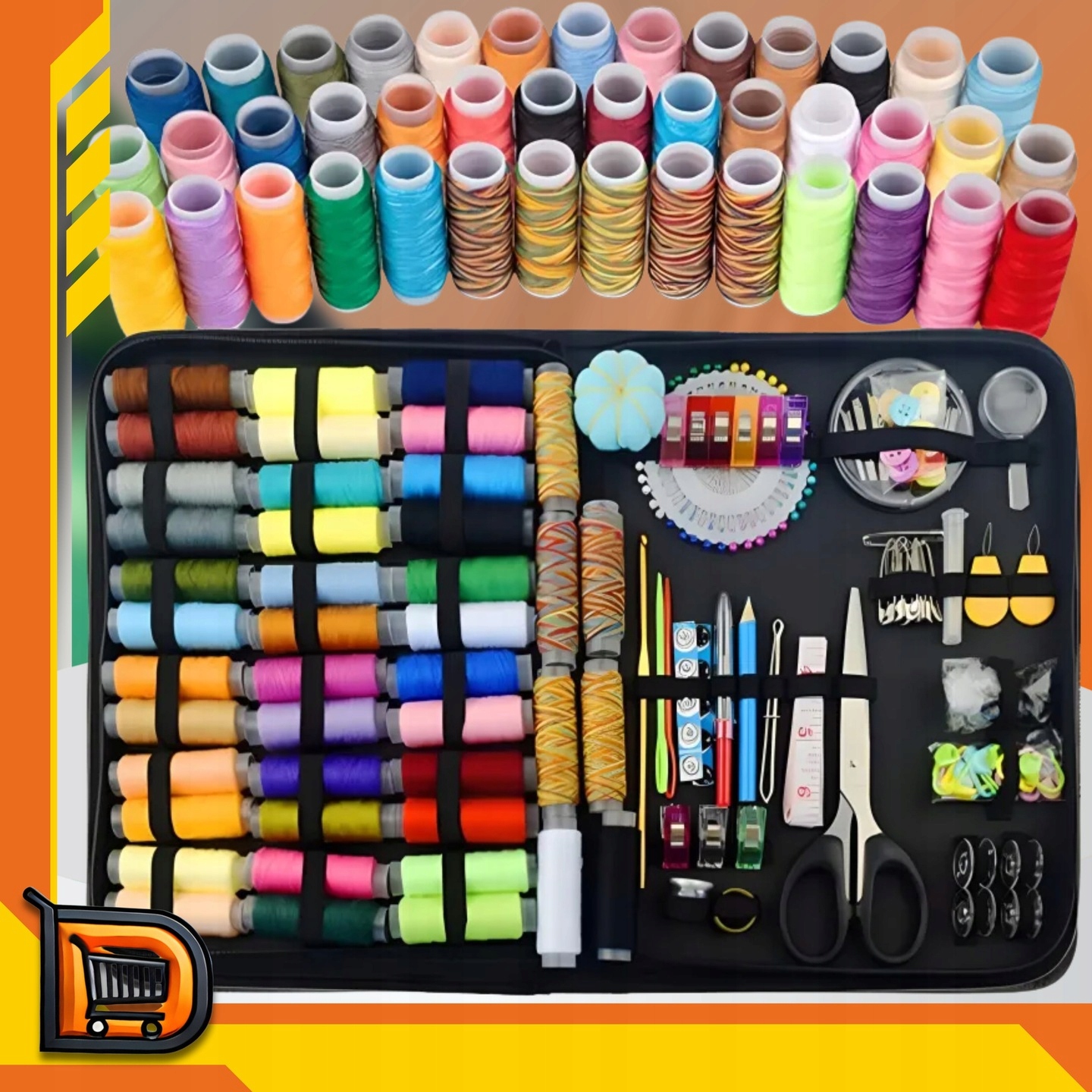 - Полный набор из 226 элементов - нитки, иголки, наперсток, рулетка, булавки, пуговицы, ножницы и многое другое.