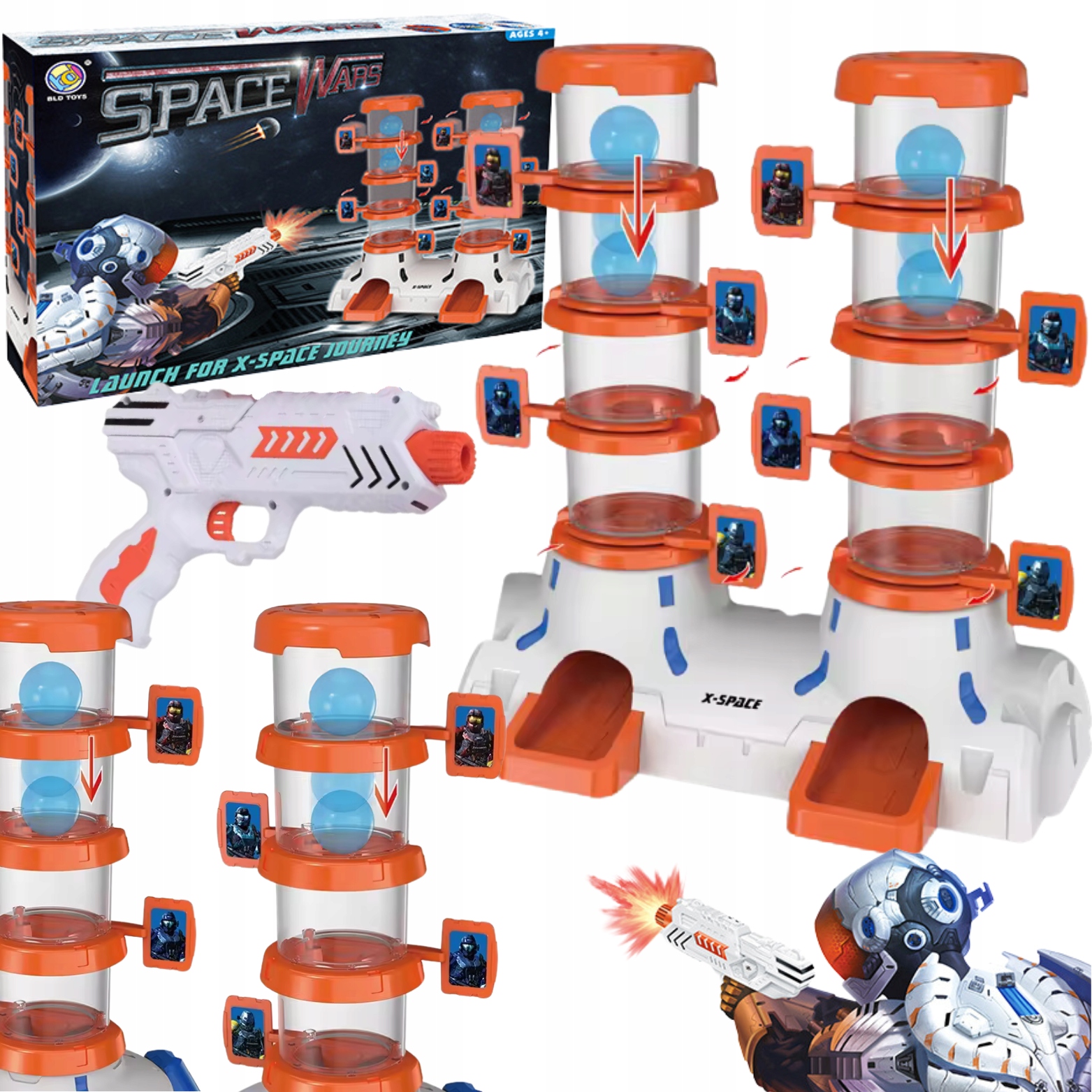 Стрелковый набор: Башни, которые в наборе выполняют роль мишеней для стрельбы, размещены на специальной подставке, обеспечивающей динамичное и требовательное развлечение. Пистолет имеет удобный и компактный размер, поэтому необыкновенным развлечением смогут насладиться дети любого возраста. Ружье, готовое к стрельбе после зарядки и прицеливания, обеспечивает быструю и плавную игру.