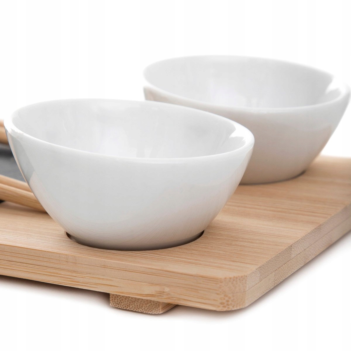 <р> В набор СУШИ входит бамбуковая доска с выемками для мисок, черный камень для размещения суши, 2 фарфоровые миски для соевого соуса и васаби, 2 набора бамбуковых палочек для еды и 2 фарфоровые подставки для палочек. Камень в виде вставки в доску – очень практичное решение – комплект не нужно убирать со стола, достаточно вынуть грифельную вставку и принести на нее новую порцию. Камень прохладный, поэтому он также положительно влияет на температуру суши и ее вкус.Материал