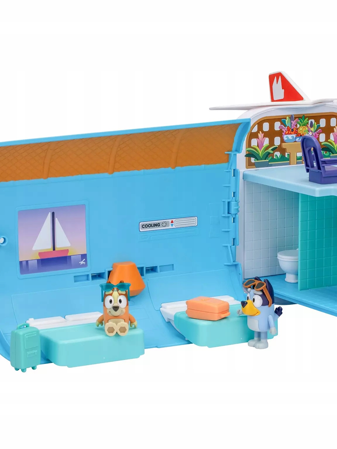 Откройте раскладушку. Самолет, который можно открыть, чтобы увидеть игровой набор шириной 70 см с двумя уровнями и большим количеством места для исследования, включая вестибюль отеля, спальню и пляж! Кабина превращается в лодку, добавляя приключения, с более чем 25 звуками и фразами из сериала, австралийским паспортом и листом наклеек для дополнительного удовольствия.