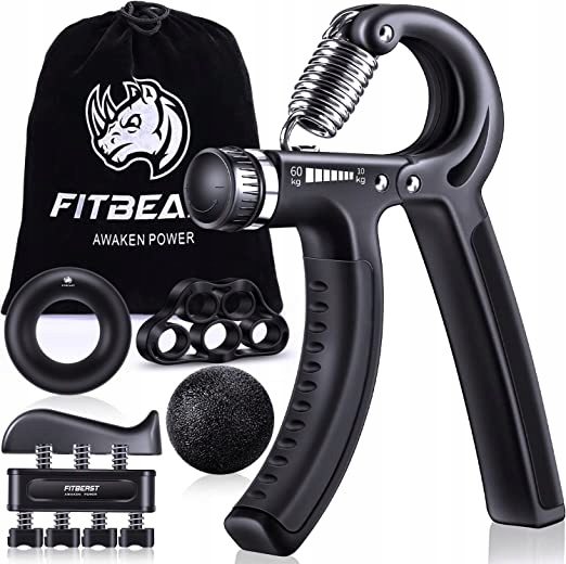Включает регулируемую рукоятку, устройство для тренировки пальцев, ленту с цепью сопротивления для растягивания пальцев, кольцо для увеличения силы хвата.