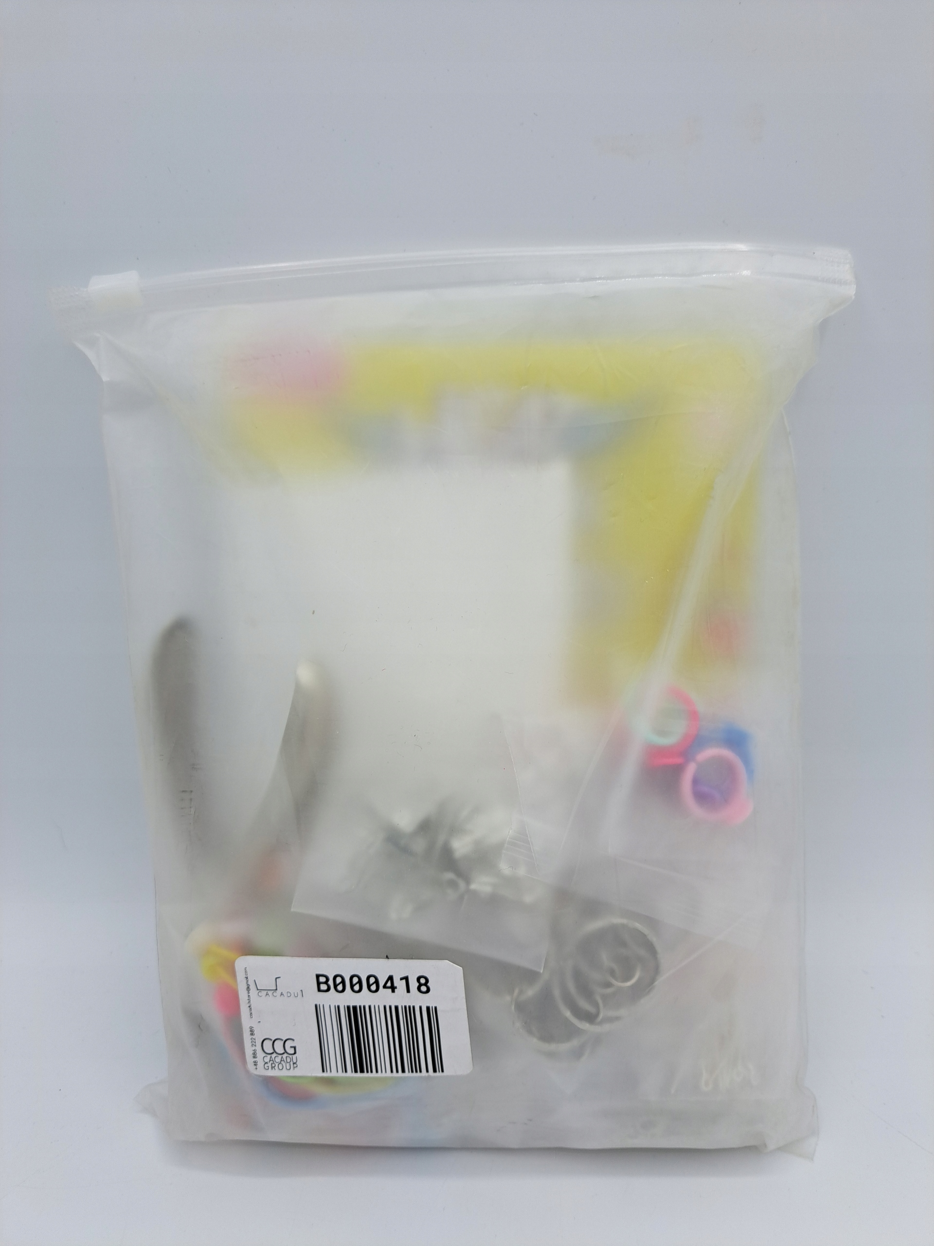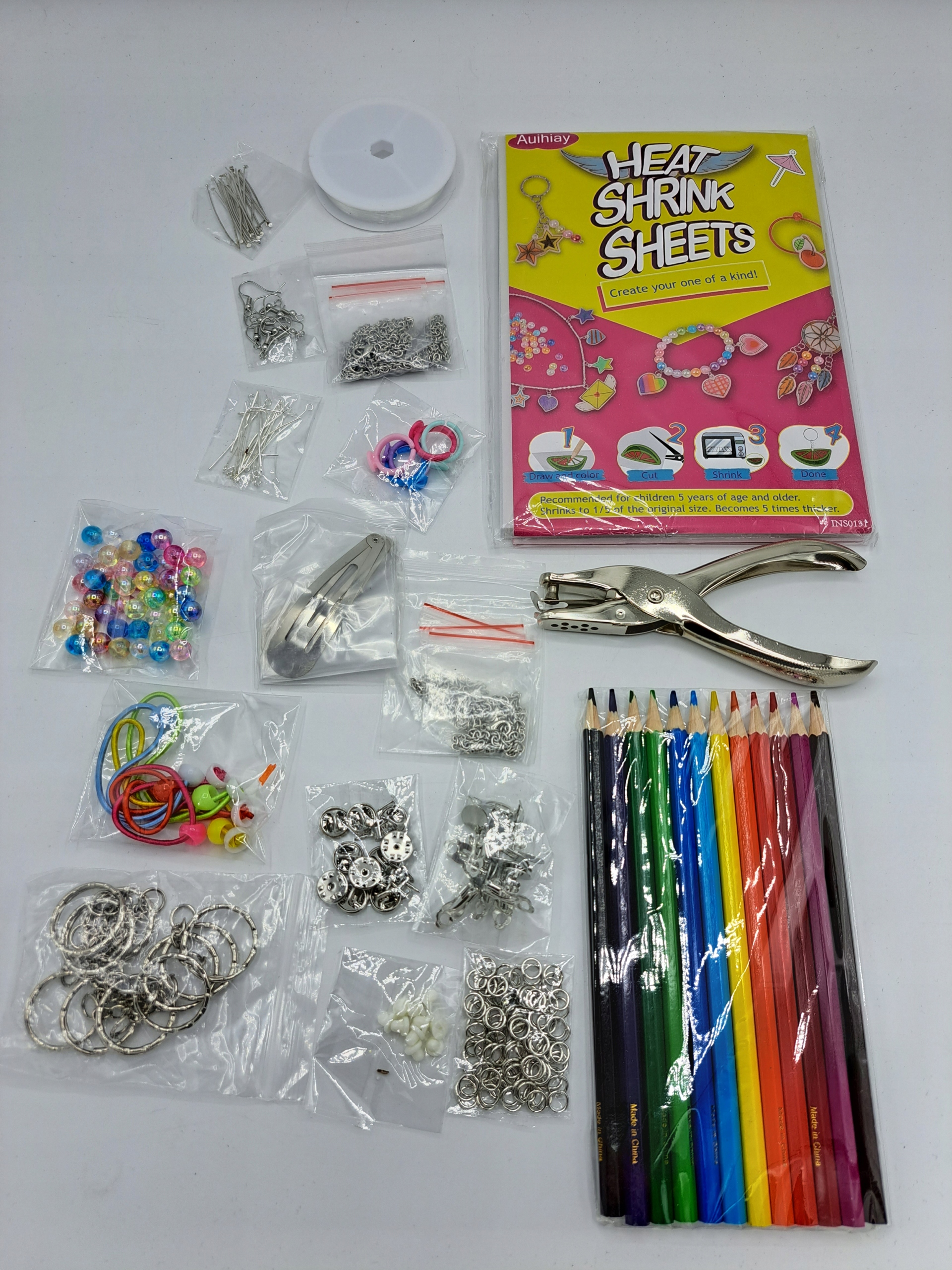 В комплект входит: 20 отшлифованных пластиковых листов, 6 отшлифованных листов с рисунком, 12 цветных карандашей, 272 аксессуара для брелоков, 1 дырокол