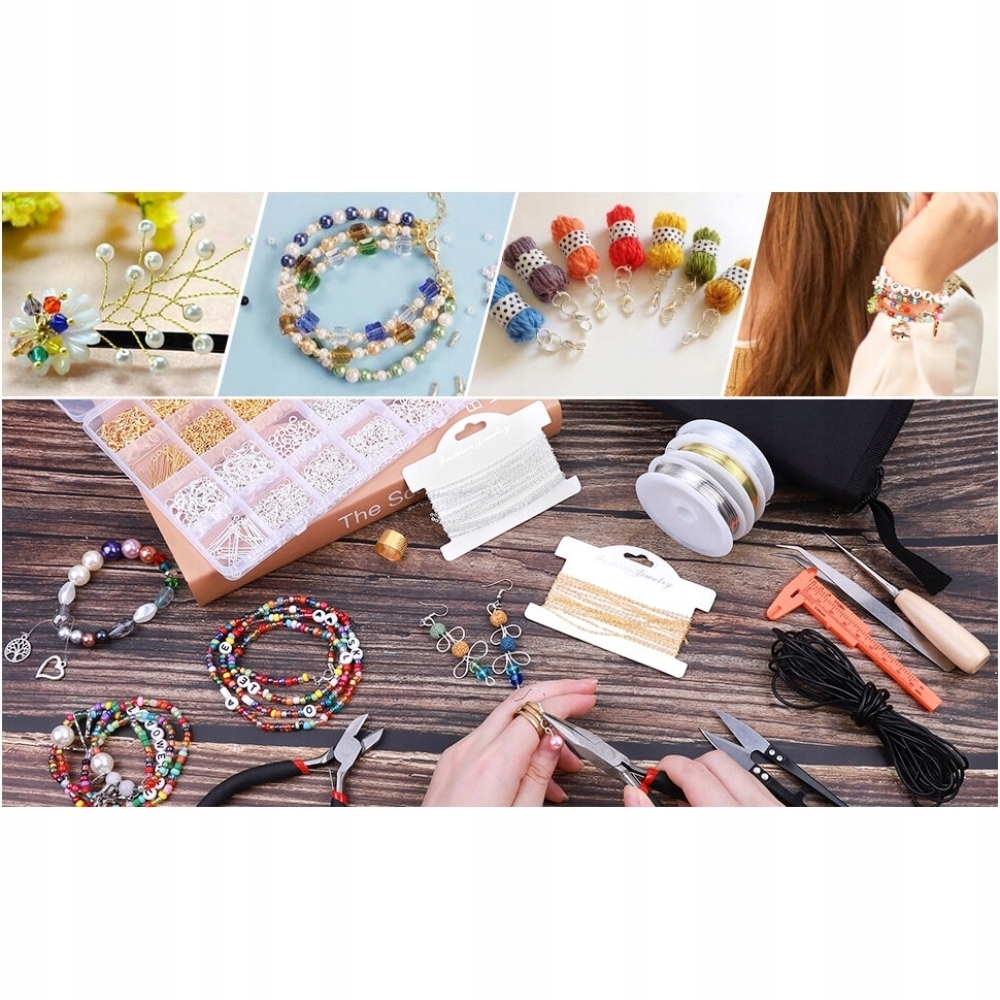 В комплект принадлежностей для изготовления ювелирных изделий входят 3 плоскогубца, 2 мотка медной проволоки, 1 эластичный шнур, 1 вощеный шнур для ожерелья, 2 мотка цепочки для ожерелья, 6 игл, 2 пинцета, 1 зажим, 1 шило, 1 открывалка для колец, 1 кольцо для наперстка, 1 ножницы для ниток, 1 рулетка, 3 иглы Нитки, 1 чехол на молнии, 1 регулируемые ручки помощи, 1830 предметов ювелирной фурнитуры, включая основные инструменты и находки, необходимые для большинства проектов по изготовлению серег, ремонту ожерелья и браслетов.