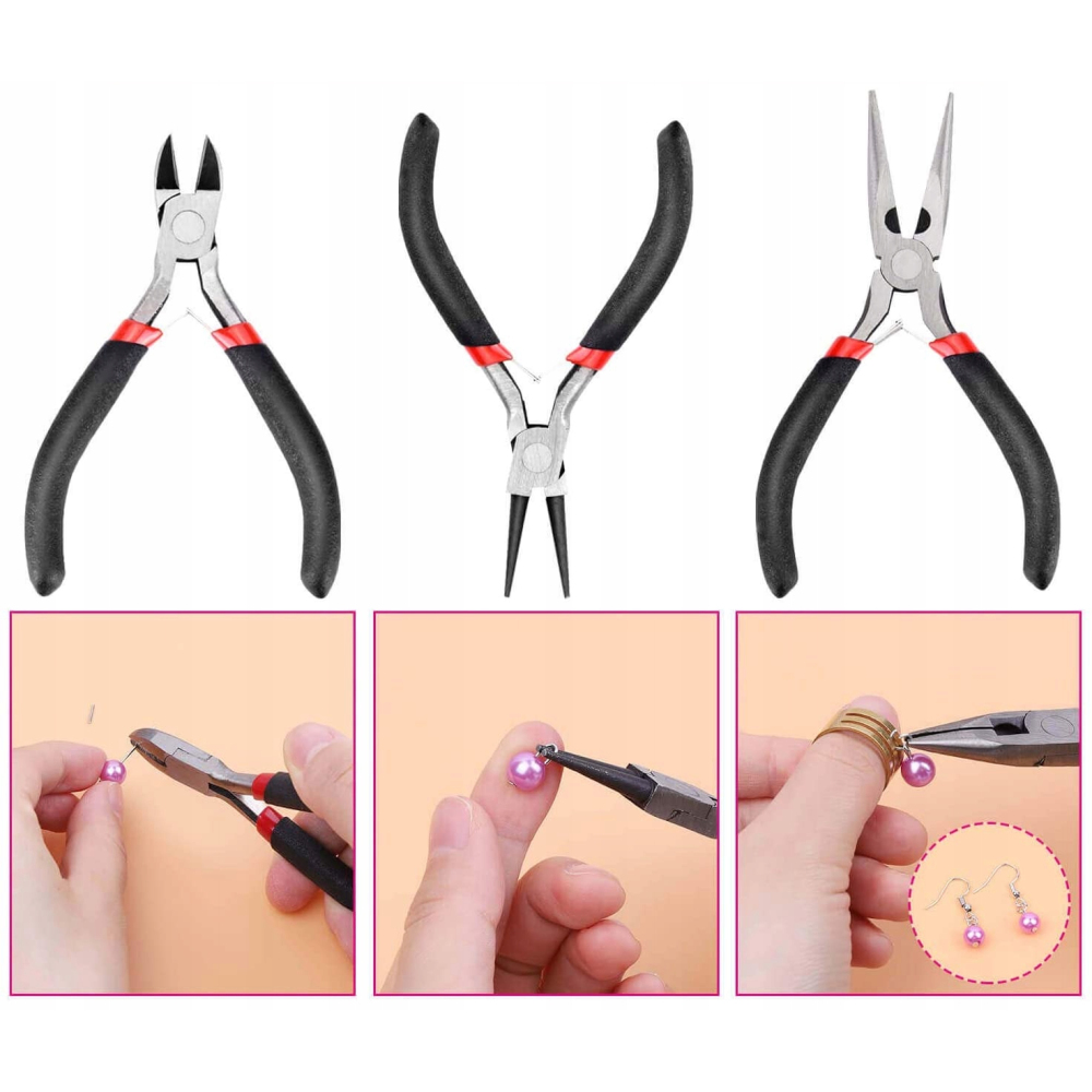 В набор инструментов для ремонта ювелирных изделий входят 3 основных плоскогубца для ювелирных изделий: круглогубцы, кусачки и плоскогубцы для цепей. Каждый из плоскогубцев имеет двустворчатую пружину и нескользящие ручки, что делает их эффективными и безопасными в использовании.