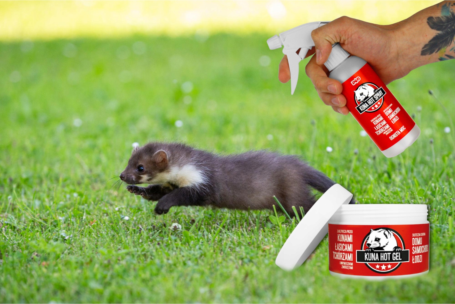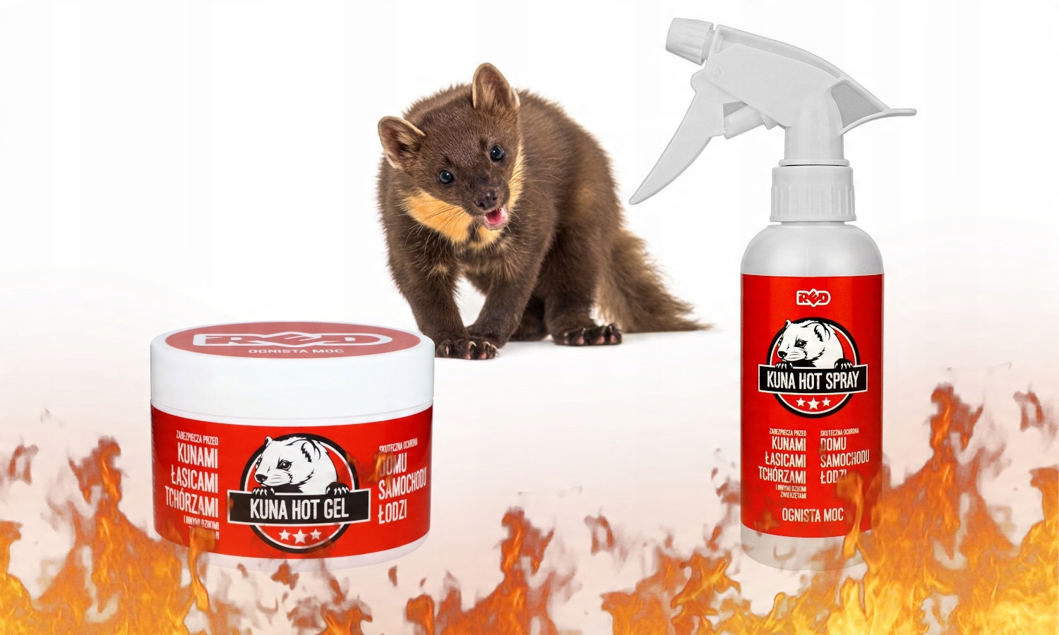 KUNA HOT компании RED — это готовые к использованию препараты, предназначенные для защиты и закрепления поверхностей, в том числе: дома, автомобили, лодки и т.п. против куниц, ласк, хорьков, лисиц и других животных, способных причинить вред, в том числе грызунов, таких как: мыши и крысы. Благодаря своей концентрированной форме комплект обеспечивает защиту от перекусывания и разрушения кабелей, проводов и звукоизоляционных ковриков, установленных в моторном отсеке. Защищает чердаки, желоба и предметы в саду. Эффект сохраняется до 12 недель.