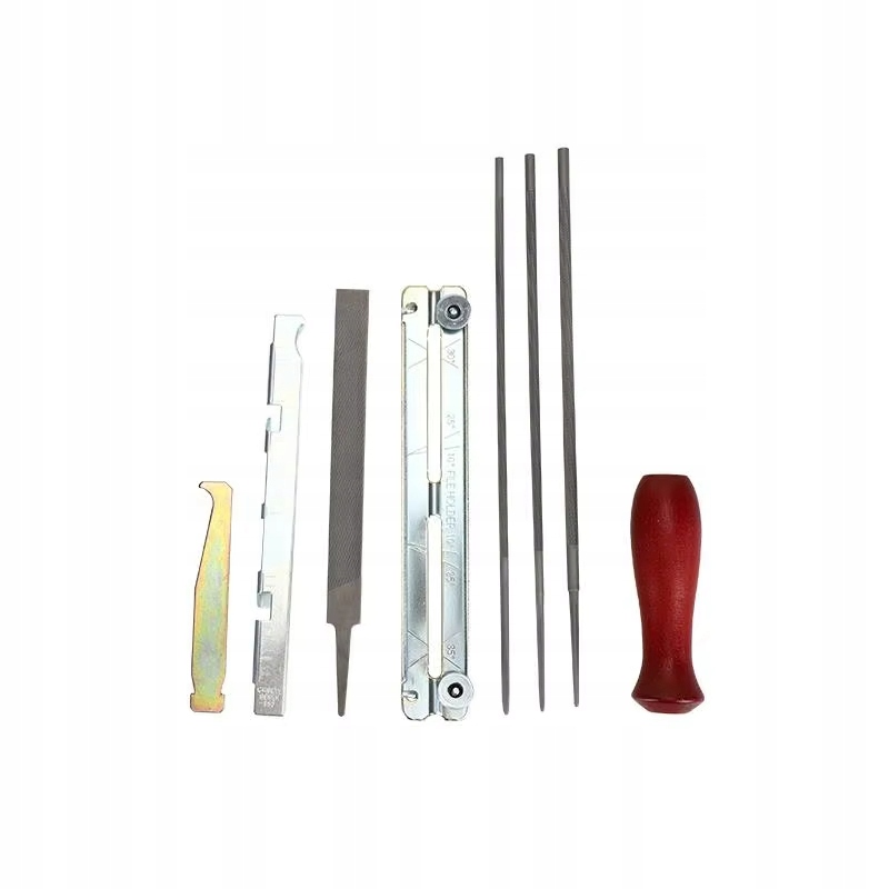 - Содержимое набора: 3 круглых напильника, ограничитель глубины, напильник, очиститель пазов, тестовый нож, держатель угловой направляющей, деревянная ручка, сумка для инструментов